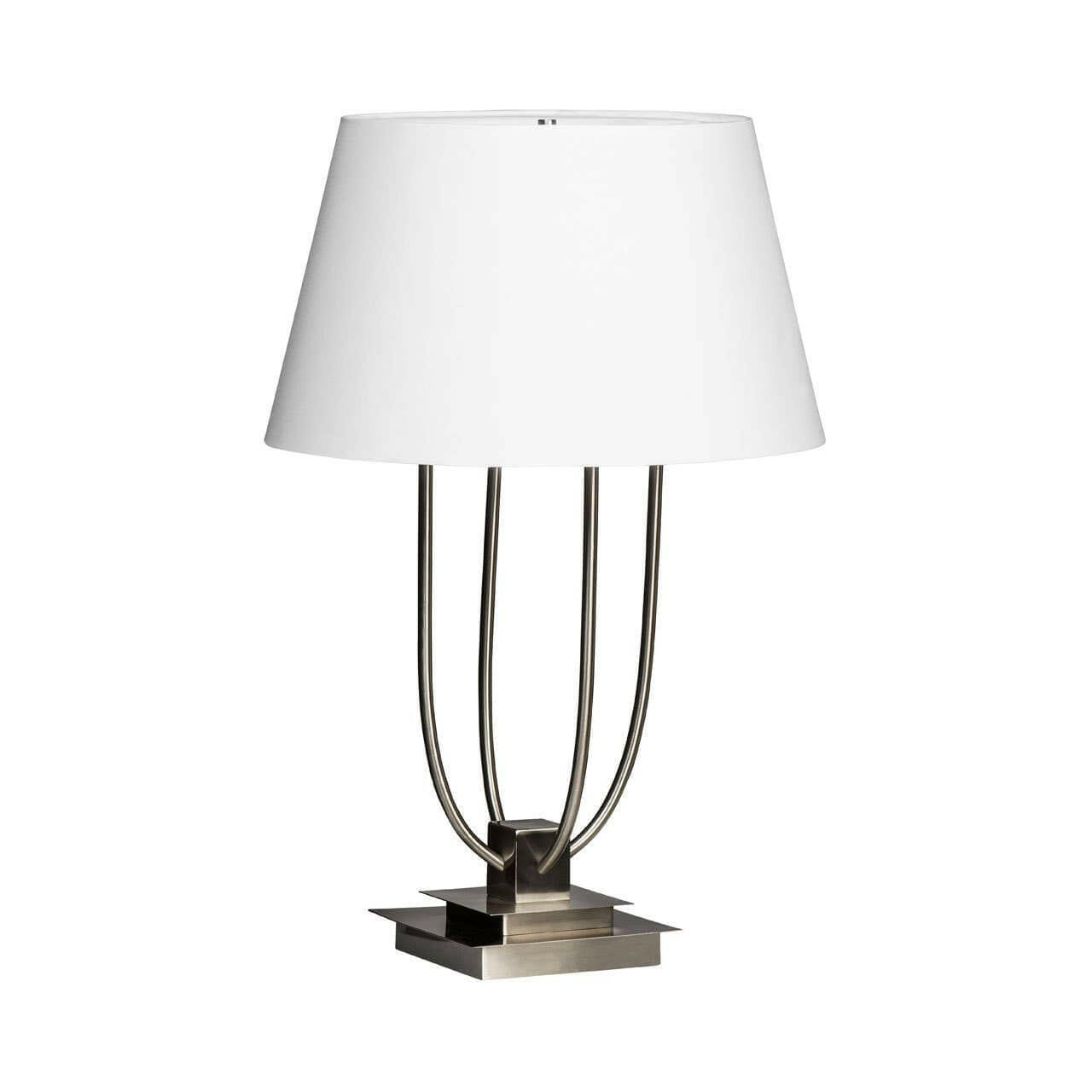 The Regents Park table lamp lends a luxury boutique hotel accent to the living room. Its smooth metal base has a sleek satin nickel finish. Four slender arms extend upwards from the base, their curved design contrasting with the square lines of the base. Its tapering shade is coloured white and diffuses the light softly.