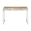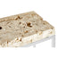 The Relic console table stands on legs made from smooth stainless steel. The silver finish gives it a reflective look, and serves to accentuate the natural beauty of the thick stone tabletop. The pitted surface of the cheese stone offers a testament to the geological process undergone by this mineral over millennia, and each one boasts its own unique variations.