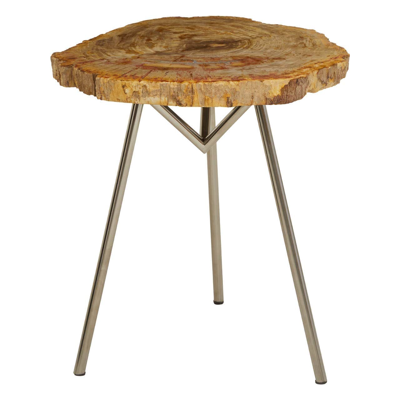 Topped with petrified wood in a round shape, this side table features curved detailing with unfinished edges. Balanced on three slanted legs in the silver finish, this table will bring an enchanting pull of nature into the home office space.