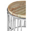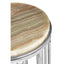 The round top is formed from a single piece of onyx stone. The stone's natural colour accentuates the thick, wavy banding that traverses its surface. The top is set into a base made from stainless steel, with a reflective finish that counterpoints the stone. The stepped design of the base gives it a glamorous art deco feel.