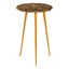 This side table features a rounded agate stone piece on top which has asymmetric edges. The minimal design, pointed metal legs give it a contemporary touch while their brass coating complements the mineral stone top.
