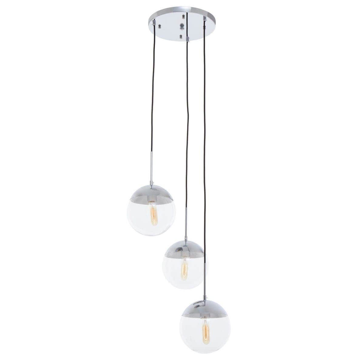 The Revive pendant light in the chrome finish will bring elegance and sophistication to the living area. Suspending from a round metal canopy, the three-light pendants have adjustable cords and the globe-shaped clear glass shades are attached at the bottom.