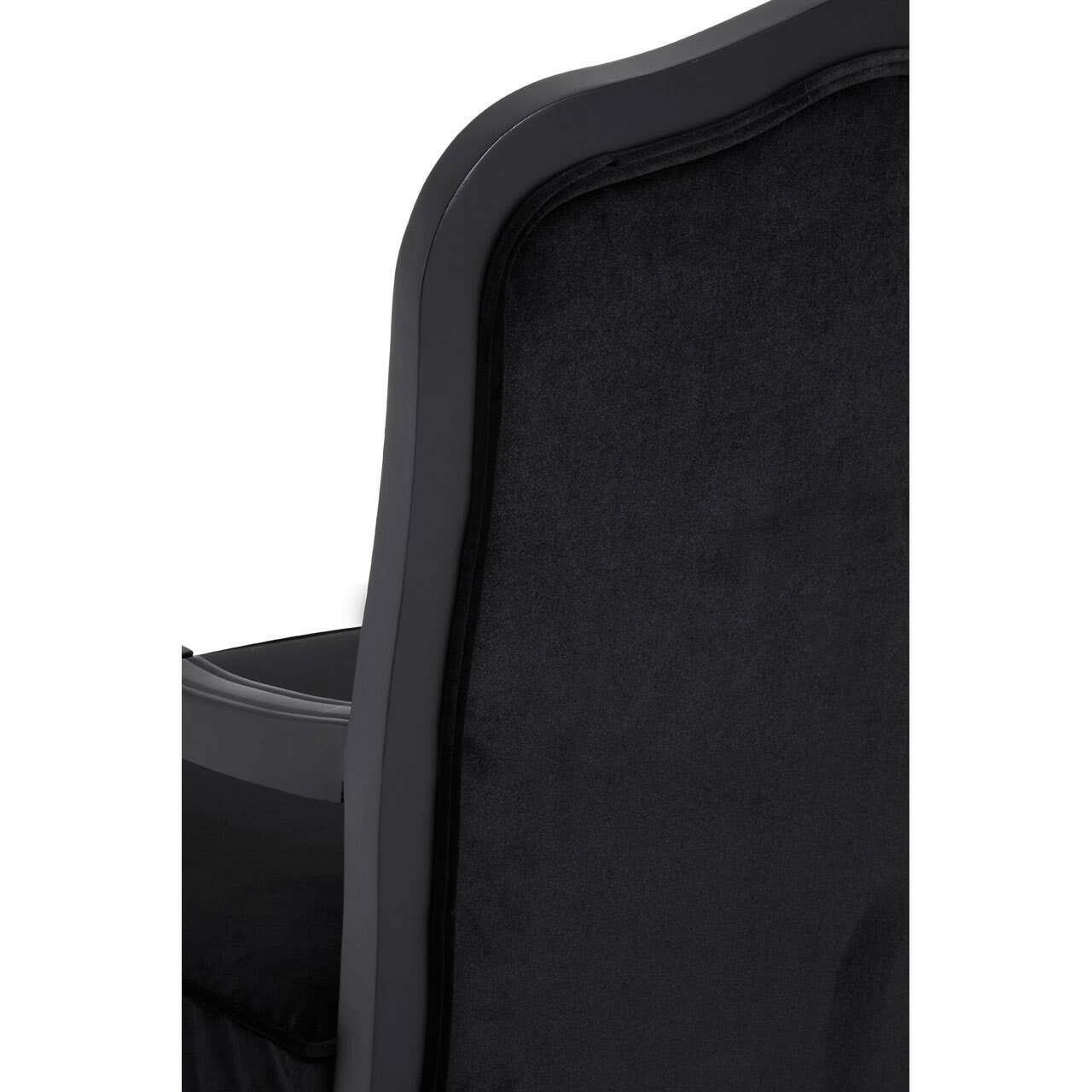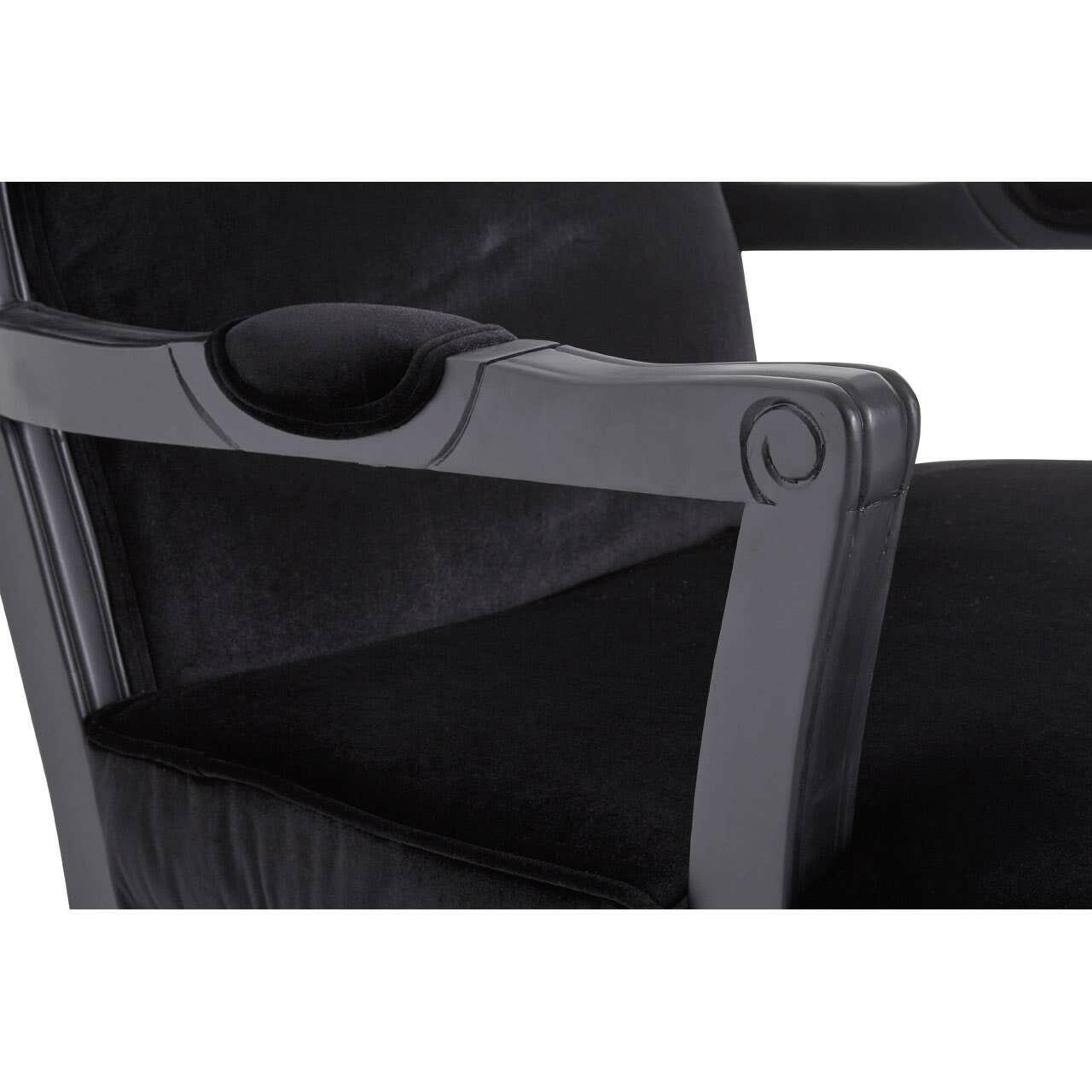 Supported by a gently curving hardwood frame, the high back of the rococo chair will provide a comfortable place to sit. The armrests feature gentle carvings, and are further enhanced by a pair of velvet elbow rests. Upholstered in matching black velvet,