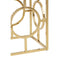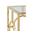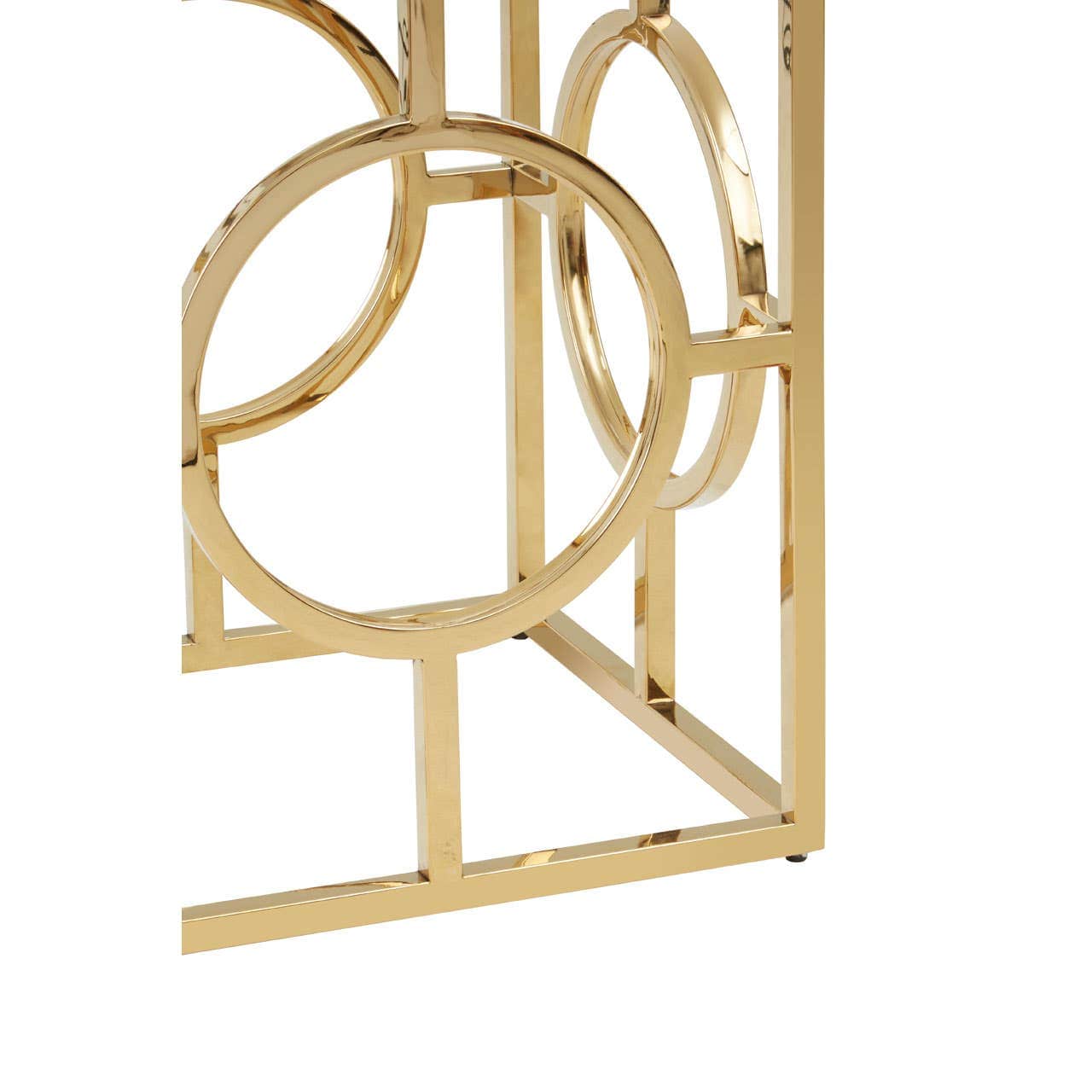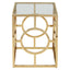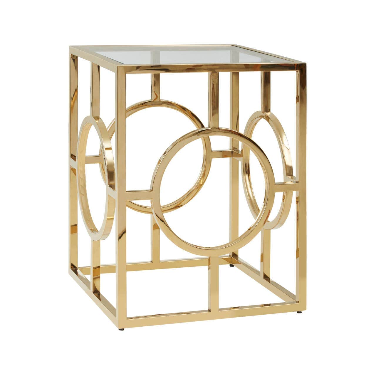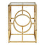 This side table has a square tempered glass top which makes the open base look airier. Its elegantly structured gold finish base features a circle design on each side which gives the table an art deco aesthetic. This table will look elegant sitting next to a sofa, with its symmetrical construction and contemporary style.