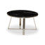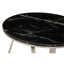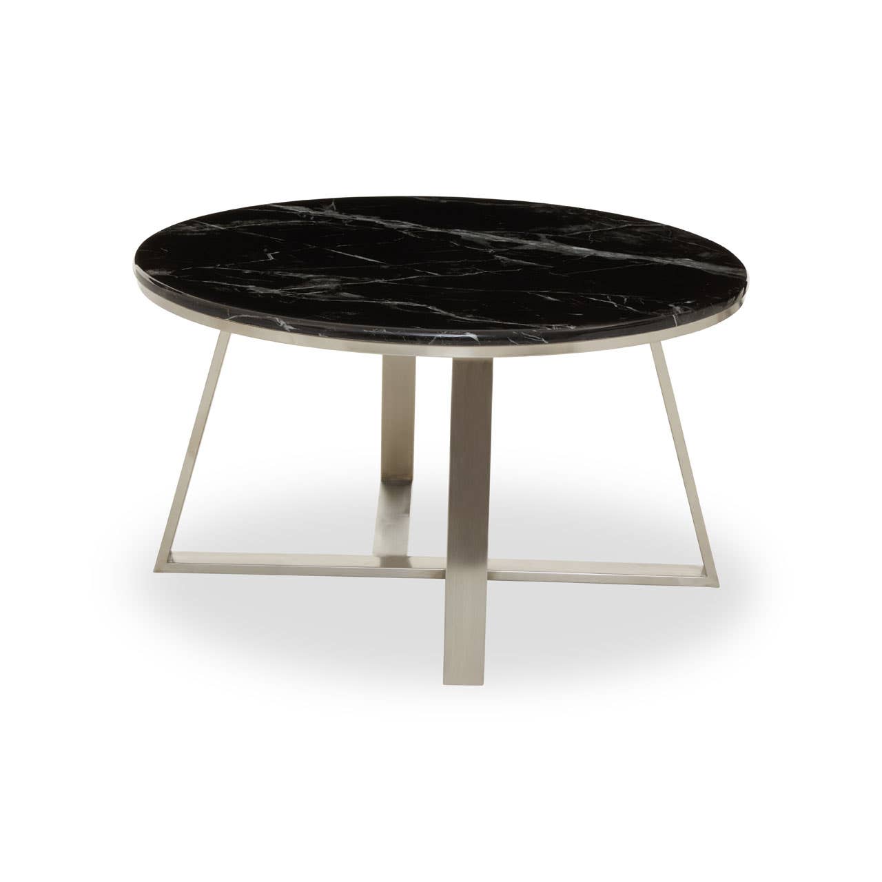 This coffee table has a sculptural stainless steel frame in a reflective silver finish that forms a cross sledge base. The sleek, angular base forms a monochrome contrast with the black marble top in sublime veining.