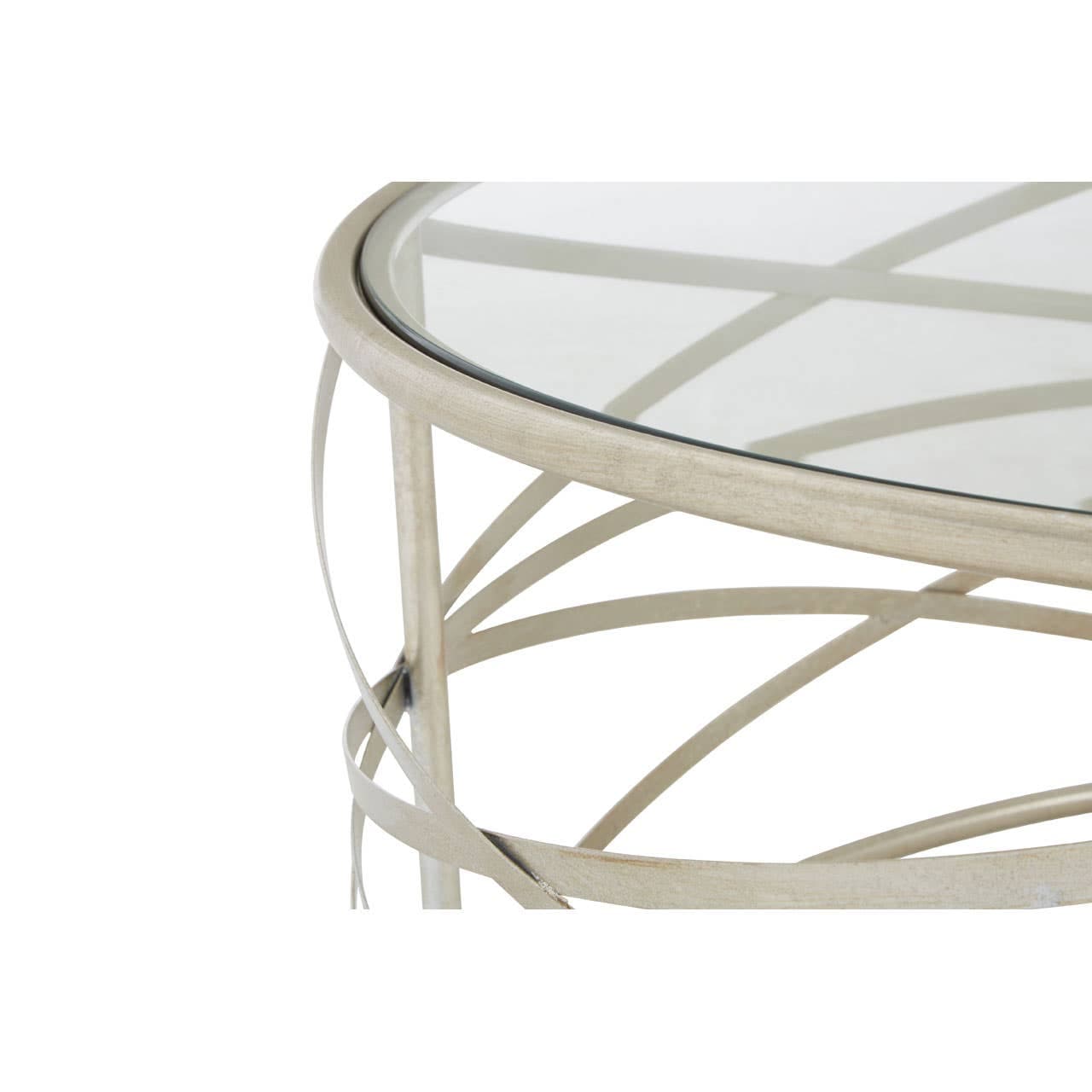 The frame of the table is made from tough iron and has a metallic silver finish. The iron is distressed, giving the table's frame and the latticed outer a textured look. Set into the top is a pane of clear tempered glass. Part of the contemporary Rubia collection, coordinate it with the matching coffee table.