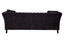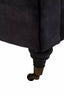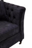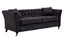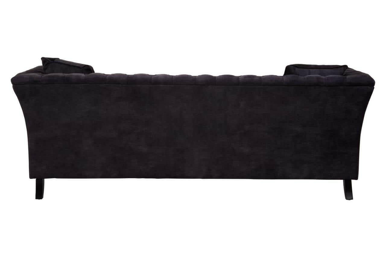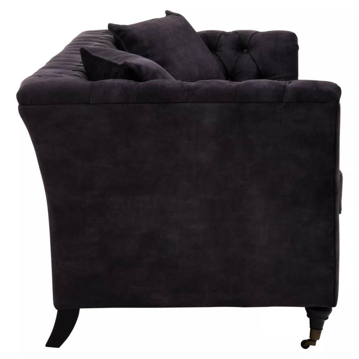 Covered in dark grey velvet, this three seat sofa has button tufting that lends it a decorative texture. Elegant curves of the back and armrests elevate elegance. Supported by castors, the sofa has matching cushions that enhance style and comfort.