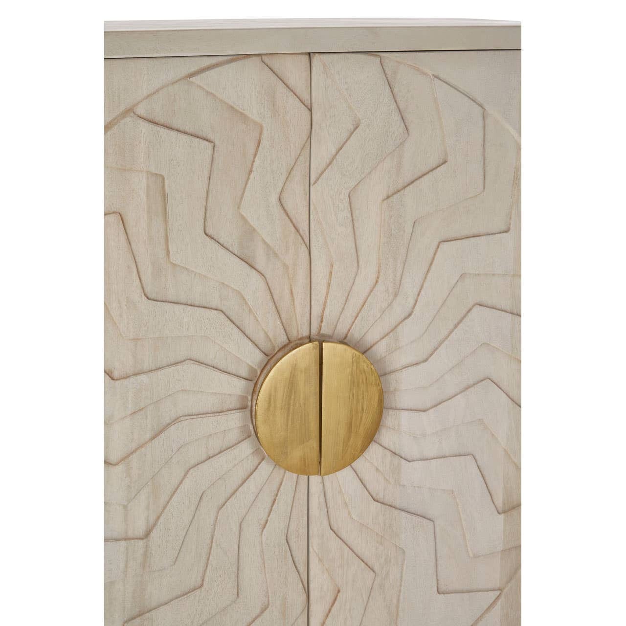 The cabinet is crafted from sustainable mango wood with a whitewash finish. Both doors are textured by the circular carving, and the handles feature an antique brass finish that complements the minimal legs.