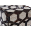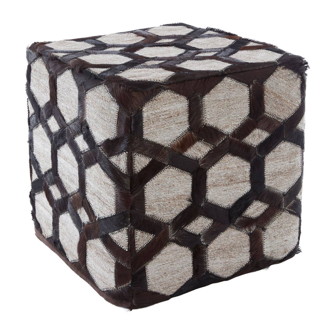 The Safira pouffe is dressed in tactile jacquard cloth. The jacquard has a light oatmeal colour that lends prominence to the dark brown leather strips. These strips are formed into hexagonal shapes and are attached with bold black zig-zag stitching. The leather enhances the tactile appeal of this cube-shaped accent piece. *This product is made from genuine cowhide. Individual units are likely to have slightly different colours, textures, or markings from the image as this is a natural material*