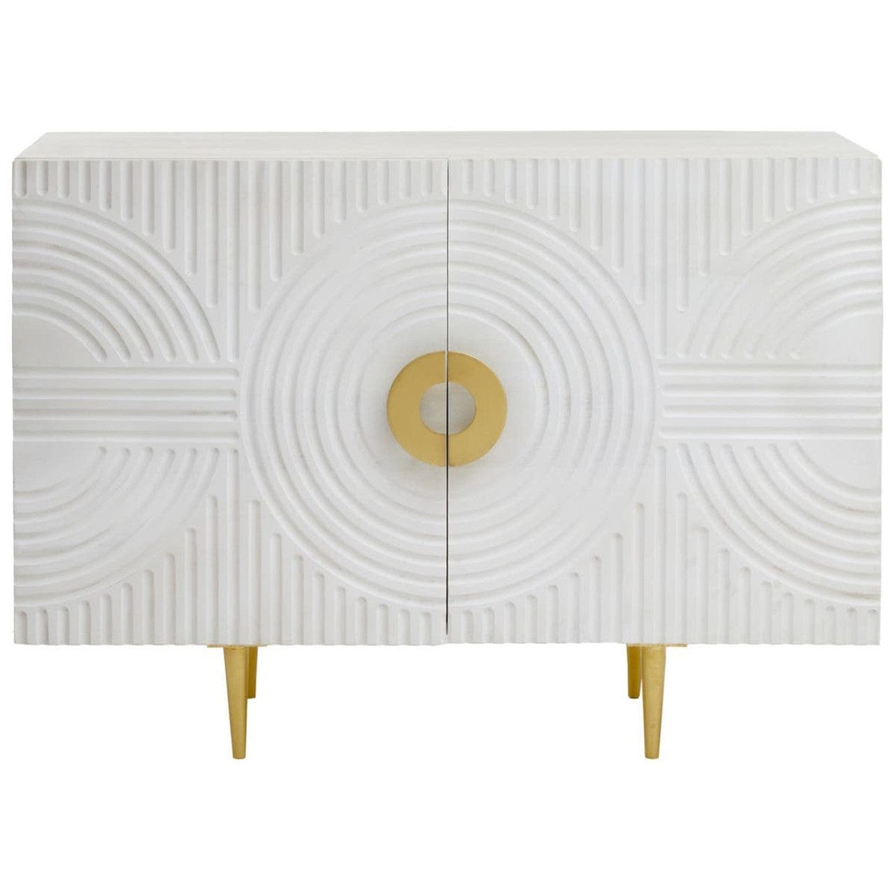 Crafted from eco-friendly solid mango wood with gold polished metal legs and two door handle, this modern sideboard exudes elegance and durability. The custom-designed circular door handle serve as a striking focal point, adding a refined touch to the interior.