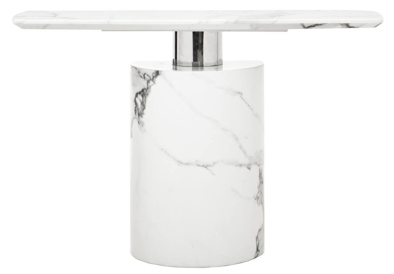 The Sesto console table features a sleek white marble top with natural grey veining. The top is a rectangular shape with rounded ends. It is supported by a substantial cylindrical base crafted from the same white marble, creating a solid and elegant foundation. Connecting the marble top to the base is a gleaming stainless steel column, providing a striking metallic contrast and a touch of modern sophistication.