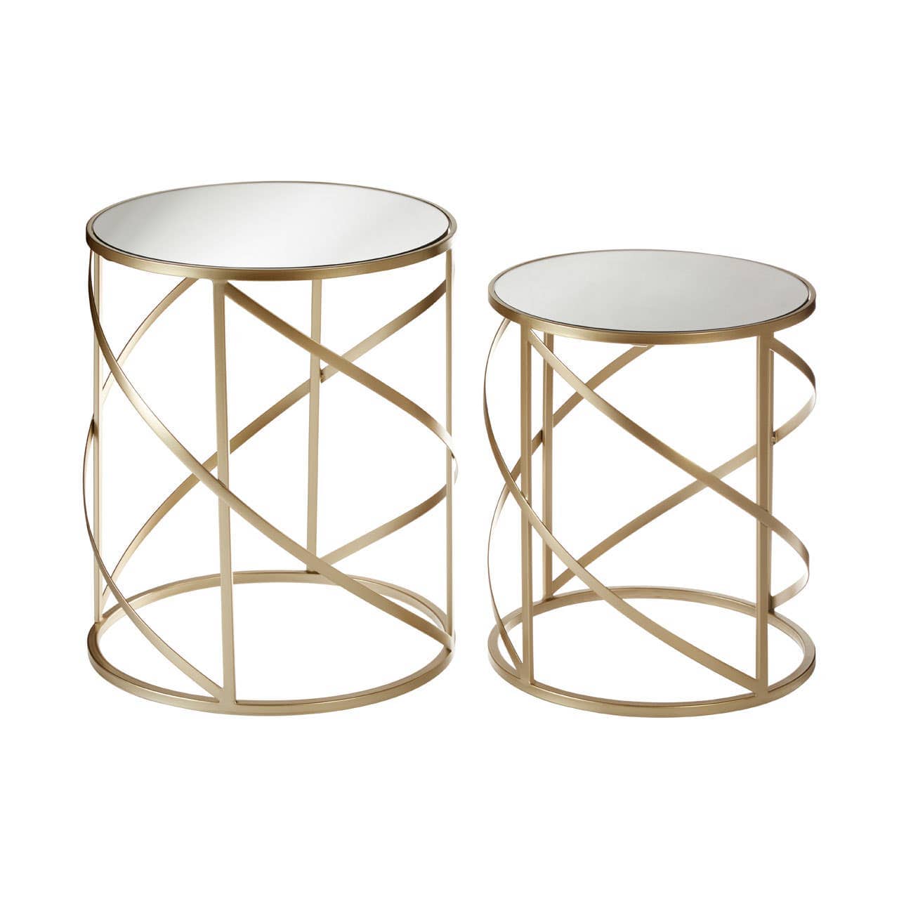 The diagonal strips that wrap around the base of the Avantis side table give each one an airy, flowing look. Made from smooth iron their champagne colour means that they style well with warm metallic textiles and accessories. The piece of mirrored glass that is set into each top of each one adds to their reflective aesthetic.