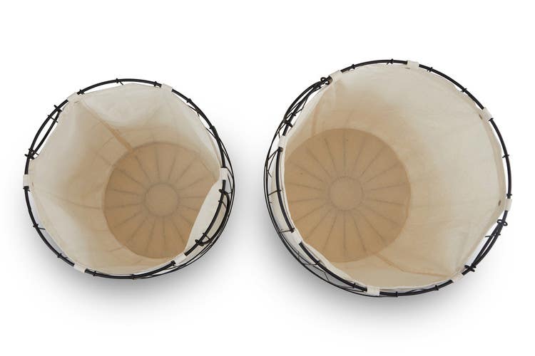Crafted from matte black wire in a grid design, this set of two rounded storage baskets have a minimal style. Each basket is supported with side handles for easy carrying, complete with a removable cotton liner that is securely attached to the frame.