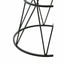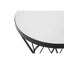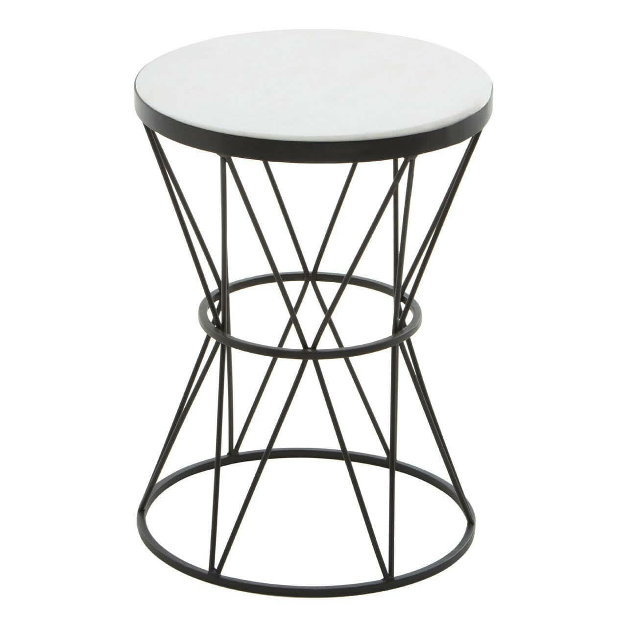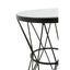 Circles and triangular shapes enhance openwork metal base of this side table. The white marble top neatly rests in the round table top and forms a monochrome contrast with the black finish angular lines.
