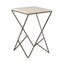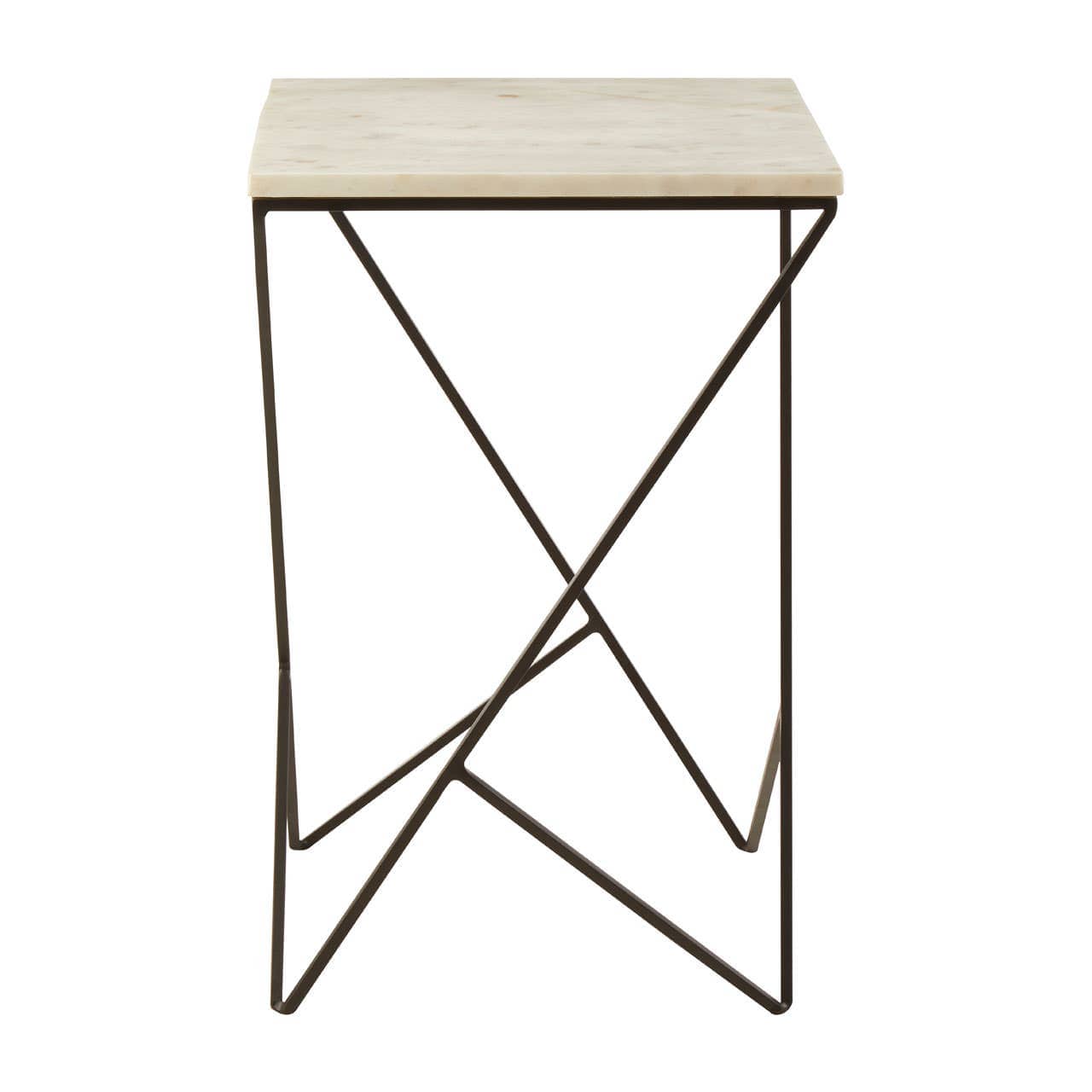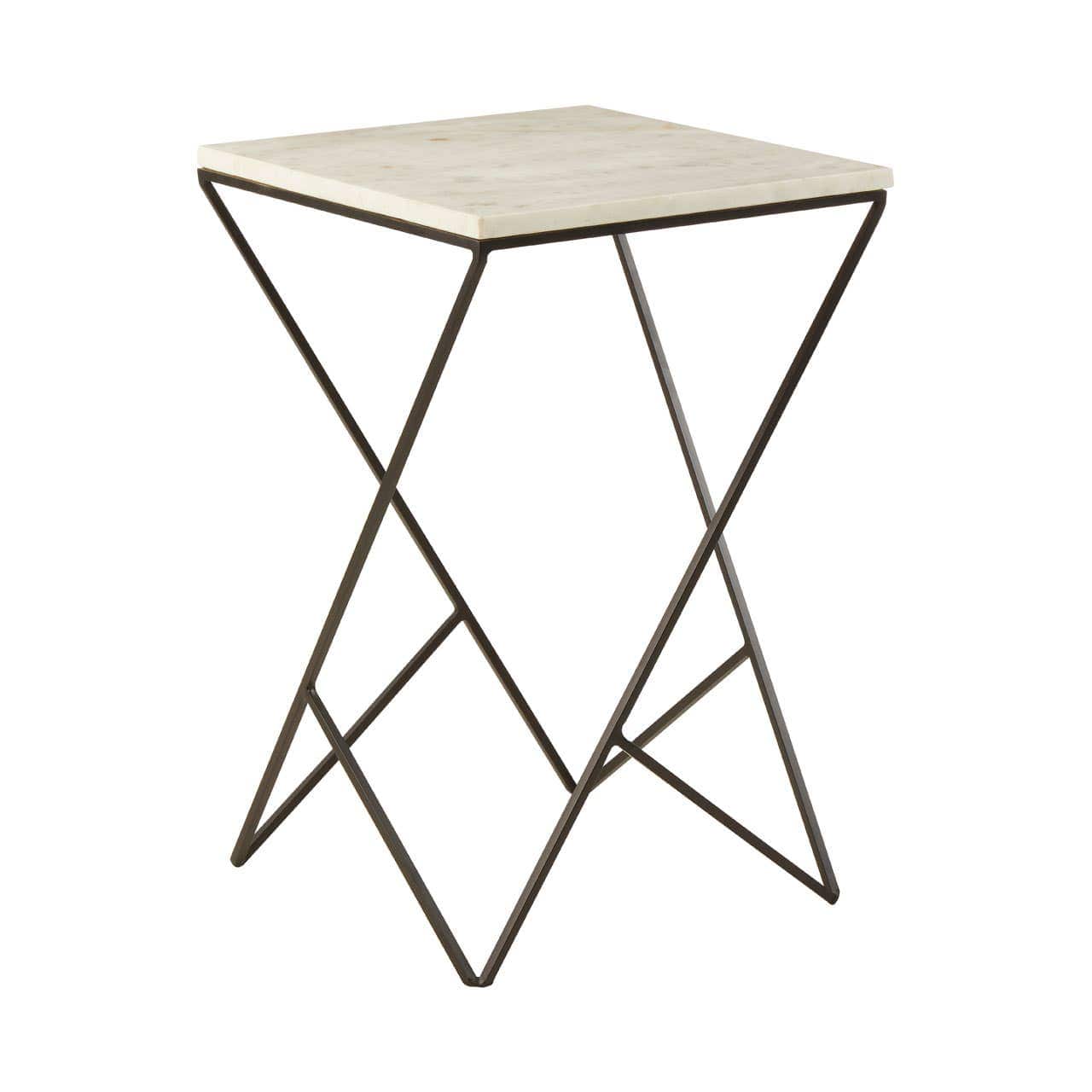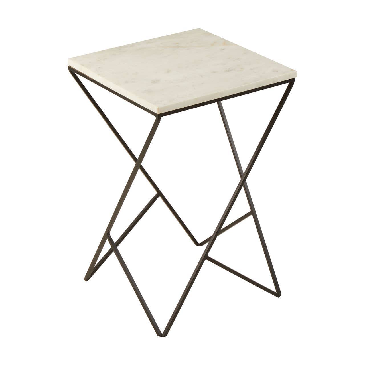This contemporary side table’s black finish angular legs feature symmetrical pointed curves which give it a geometric look. The sleek and minimal legs contrast with the white marble square top to form a monochromatic contrast. The natural stone top coordinates with the table’s open and streamlined base.