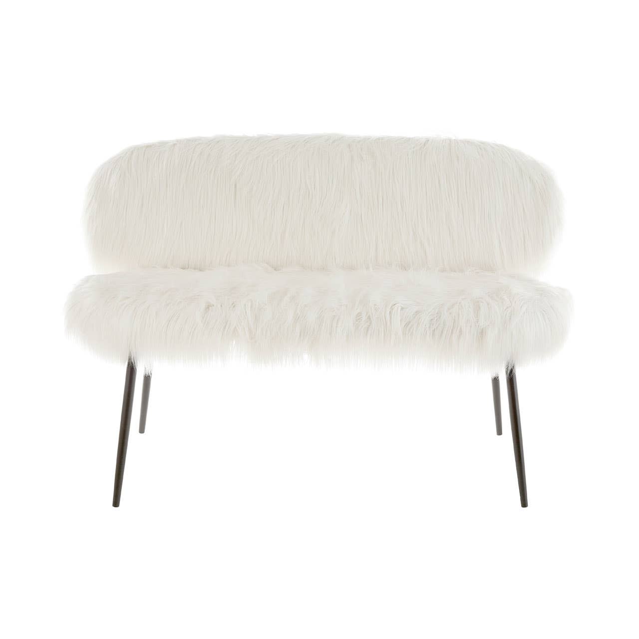 Upholstered in soft faux fur, the sofa's backrest and seat have an opulent feel, lending it to luxe style interiors. The simplistic seat is raised from the ground by slender, slightly tapered legs. The four legs are created from robust metal and feature a sleek black finish, contrasting with the crisp white seat.
