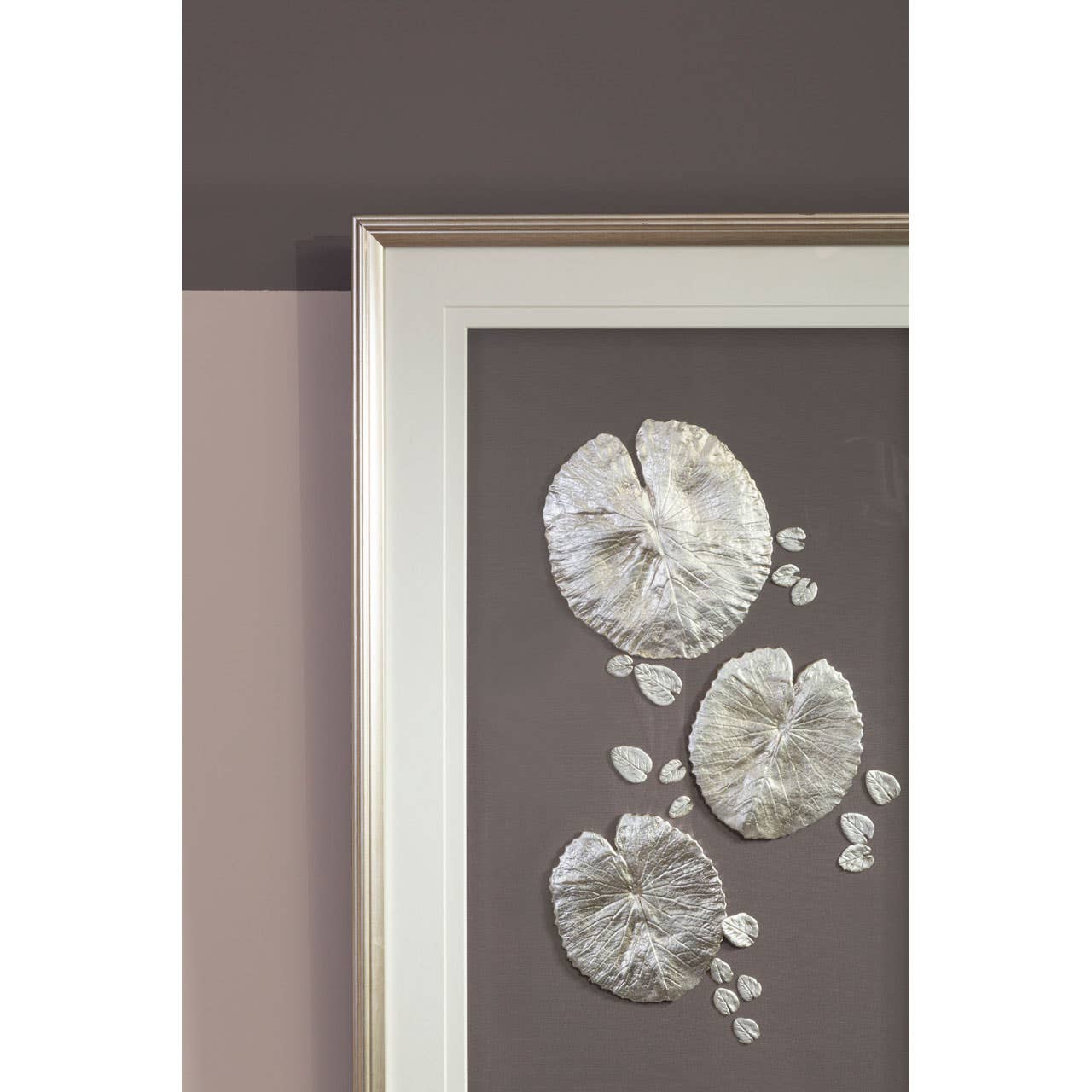 Three metallic leaves sit behind a pane of clear glass, with smaller versions scattered around. The realistic design creates a textured aesthetic, and the metallic finish introduces a cool palette. Set against a darker background, the piece is finished with a classical style frame, coloured to complement the silver.