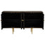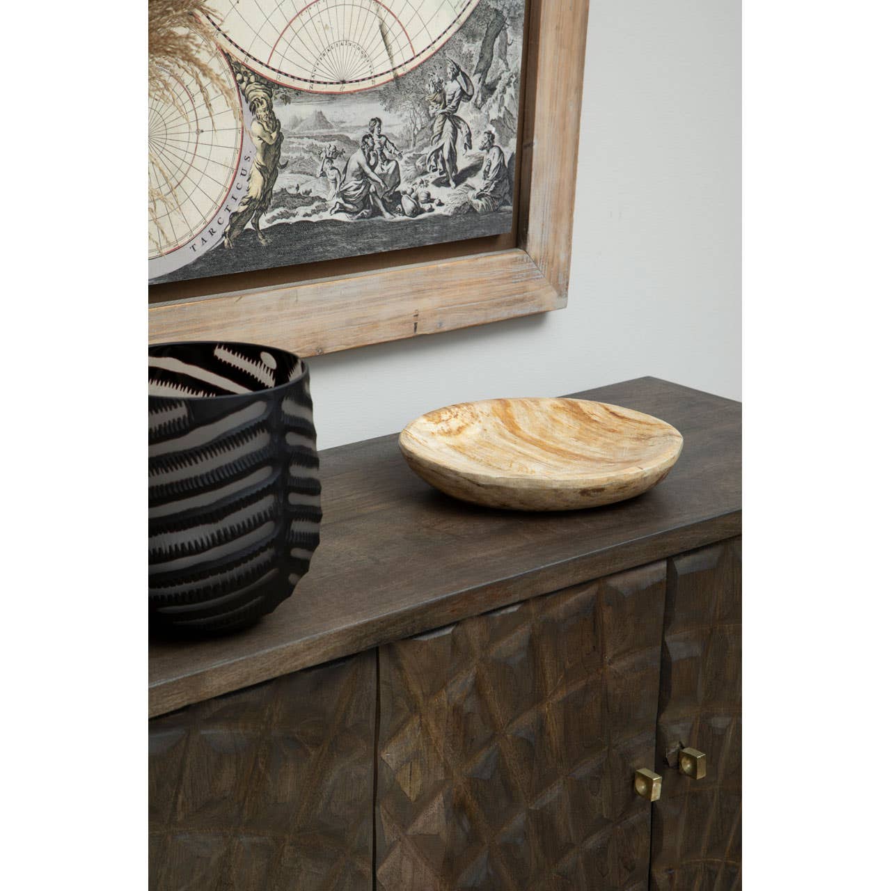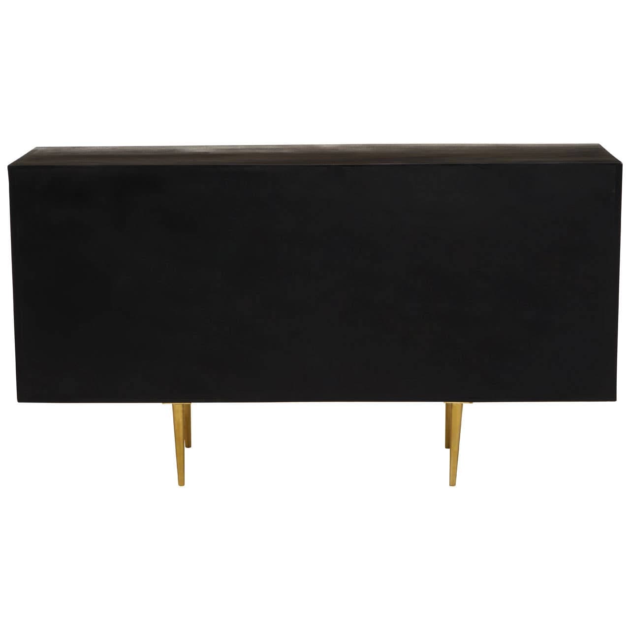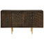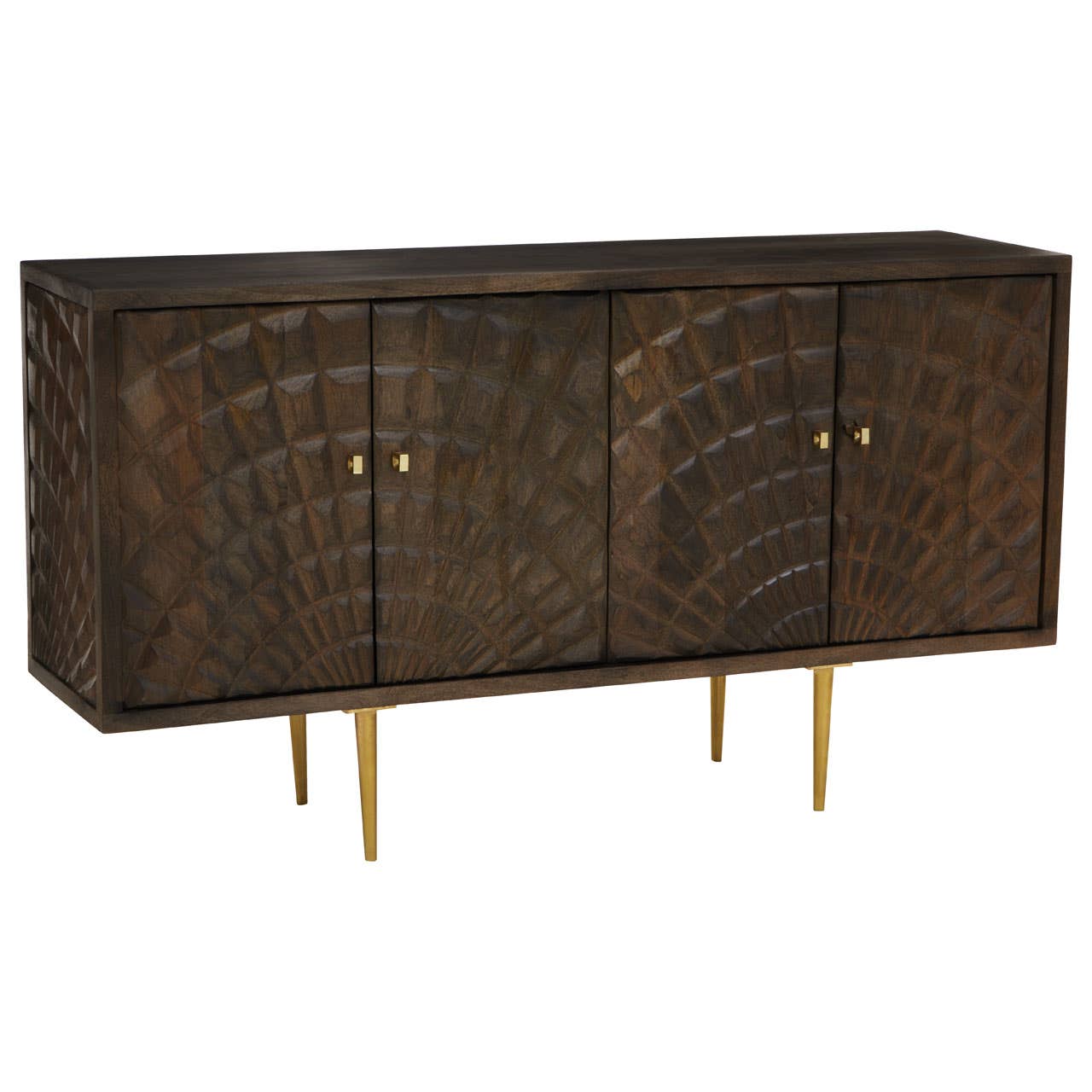 Finished in solid mango wood paired with sturdy gold legs, this brown finished sideboard features embossed faceted patterns in an array of natural splits and graining. The appealing brown and gold finished rhombus patterns highlight the additional geometric style of this sideboard. Ample storage placed on sturdy gold legs offers functionality and versatility. Indeed a wise choice to display accessories and storing items.
