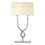 This exquisite, boutique hotel-style table lamp has a stainless steel base with a high gloss nickel finish. The steel frame effortlessly curves to form an elegant twisted design. The white cotton tapered shade completes the design.