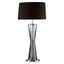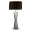 This table lamp’s exquisite twisted base is crafted from stainless steel in a reflective nickel finish. Pinched with a metallic ring at the centre, the hourglass shape contributes to its aesthetically pleasing look. Complemented with a black fabric shade in tapered silhouette, it boasts modern luxe charm.