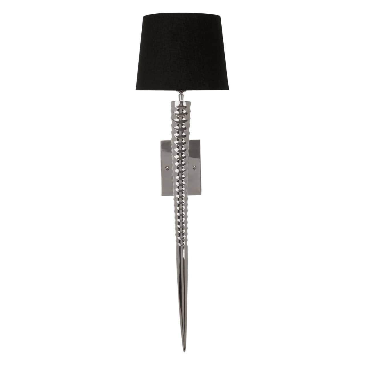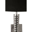 The elegantly contoured threads on its slender, tapered surface giving it a decorative texture. Contrasting its silver tones, a black fabric shade is held atop that spreads an ambient glow to its surroundings.