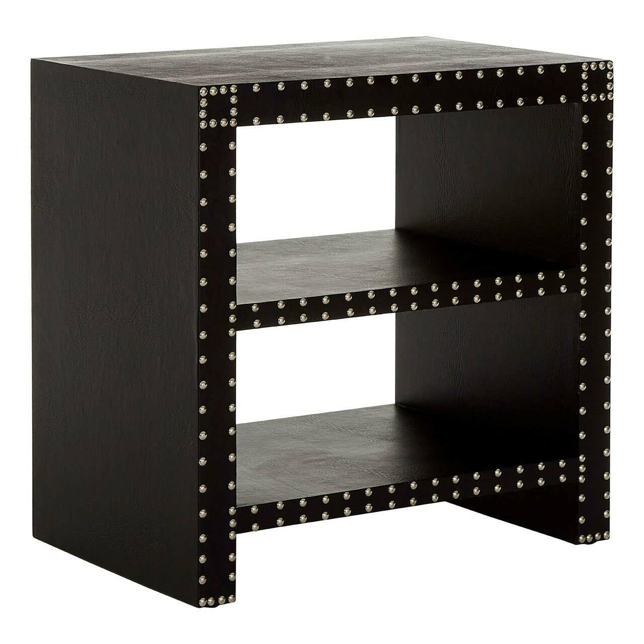 Adding prestige to your room, the stylish Sloane side table, with 2 shelves, will provide a functional and fashionable piece of furniture in your room. Made from durable MDF, the table is covered in chic black leather effect that is robust and easy to clean, making it ideal for everyday use in a busy home. Accentuated stud detail decorates the front of the table, with each one given a silver finish adding to its splendid look. The sturdy shelves are suitable for storing books, magazines and paperwork as well as displaying plants, lamps, photos, flowers and other decorative ornaments. Helping to keep your bedroom or living space organised and tidy, our stylish and practical Sloane side table will make a striking statement in your room.