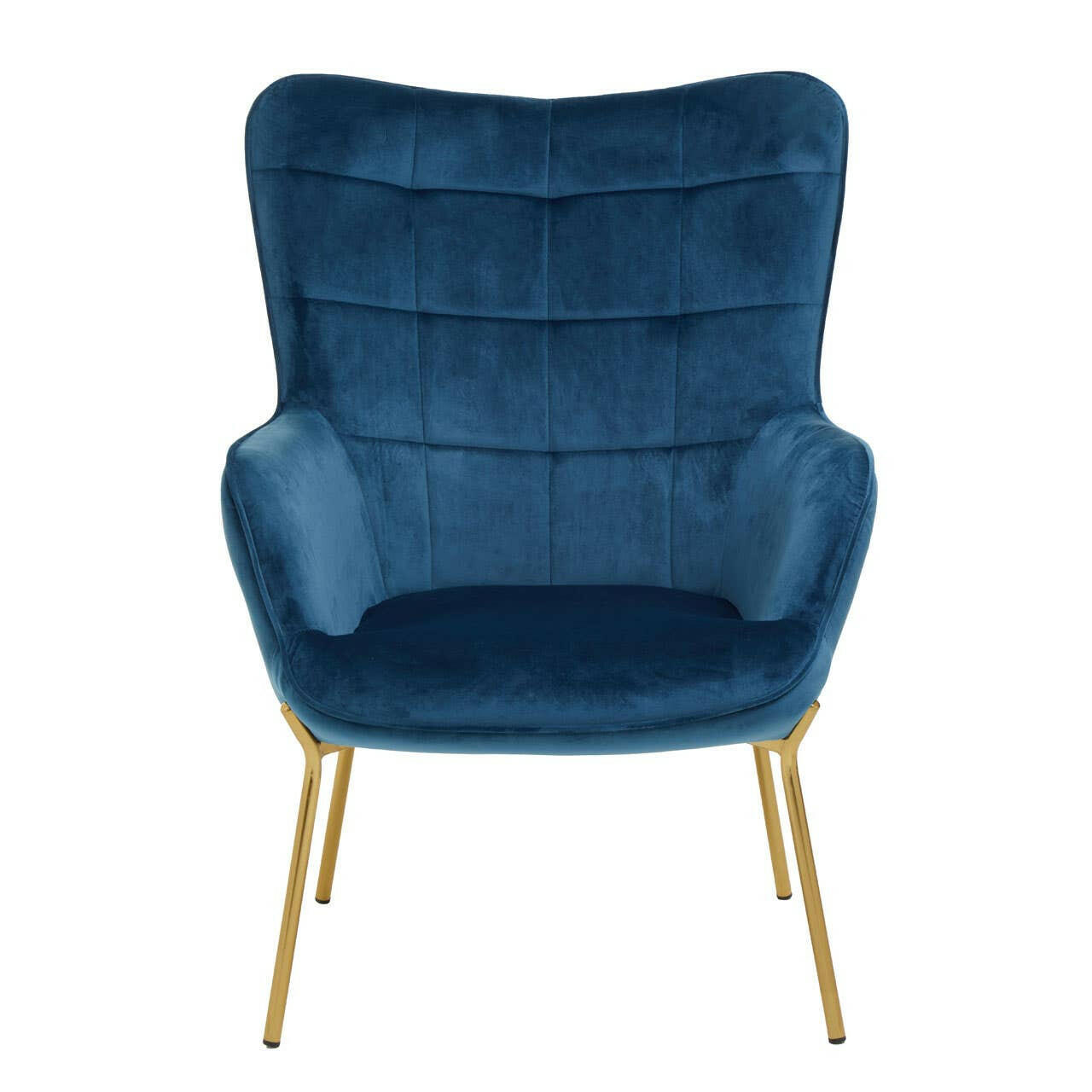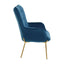 This chair features clean lined stitching and a high density foam filled seat along with a square tufted backrest. Skilfully upholstered in luxe and wear resistant blue velvet, this chair has sleek tapered legs in a gold chrome finish.