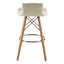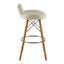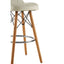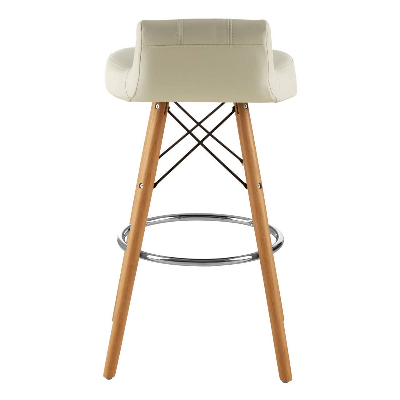 Its seat is upholstered with soft faux black leather and has a white finish. A curved backrest offers additional support, and the stitched pattern gives it a textured look. The legs are made from solid beechwood and have a light grain pattern and clear lacquer coating. A silver finish footrest is integrated into the design.