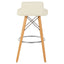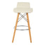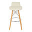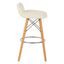 This Nordic bar stool has a white faux leather cushioned seat with a low backrest featuring a quilted diamond pattern. Natural sustainable beechwood legs are angled to give this chair a modern look. A cross design beneath the seat coordinates with the minimal legs and is complemented with the hooped footrest to complete the design.