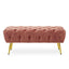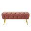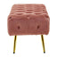 Upholstered in plush and luxurious dusty pink velvet, this rectangular stool has a comfortable seat in dense button tufting that lends it depth and texture. The gold finish tapered metal legs complement the smooth velvet and contribute to the overall glam appearance.