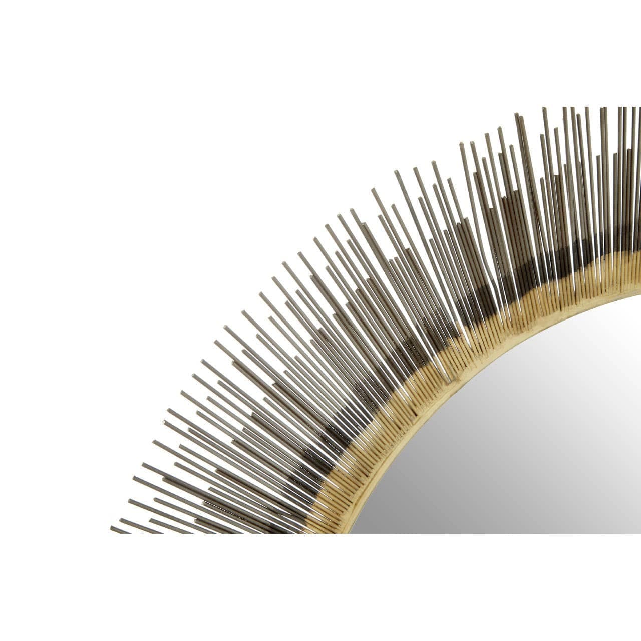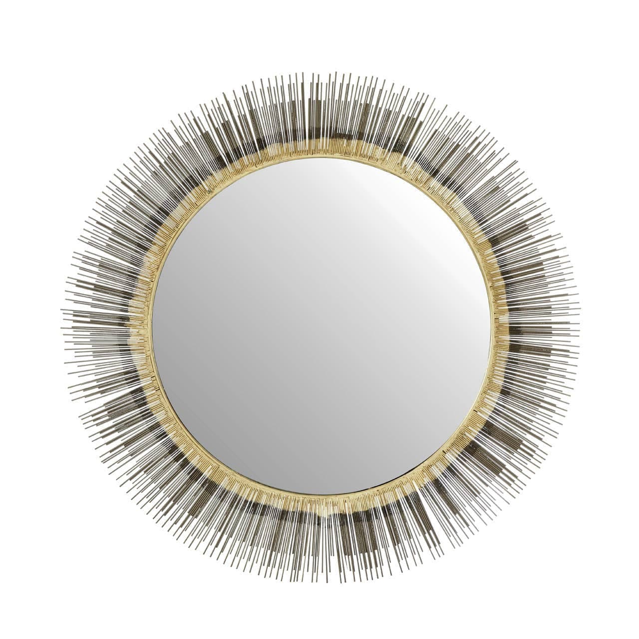 This wall mirror features a brass finish iron frame with sleek iron rods emanating out in distinctive lengths. The circular mirror is accented by slim spokes, creating a contemporary look with tonal variations in the metallic finish.