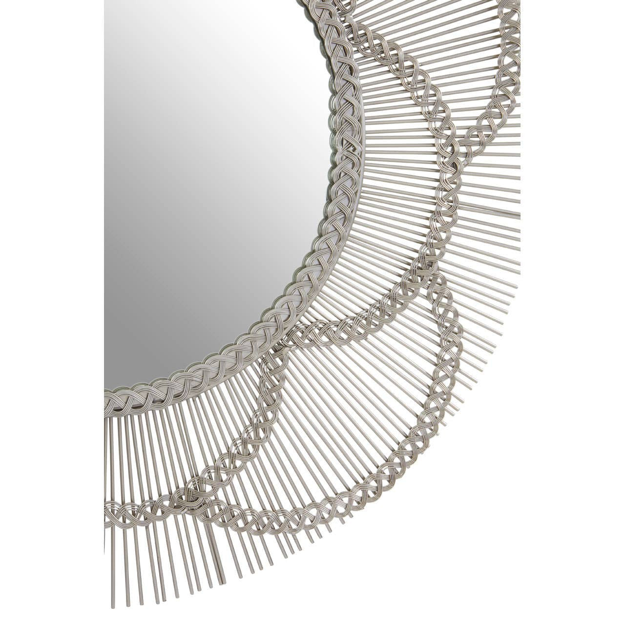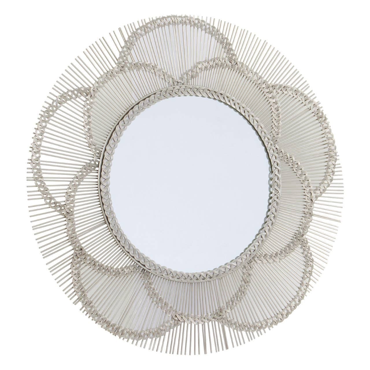 A weave of semi-circular lines surround the reflective glass centre, creating a petal effect. These are backed by slim lines that serve to accentuate the design. Made form smooth iron, the nickel coating enhances the reflective appeal of this chic accent piece.