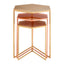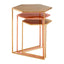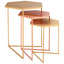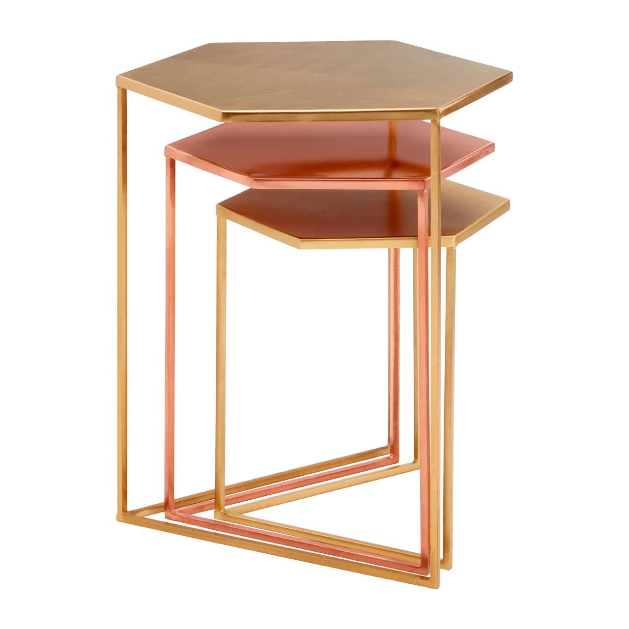 Each of the three table's boasts a variation of a warm metallic finish; gold, brass and bronze. The tables' hexagonal top and geometric, angular frame lend them a contemporary aesthetic.