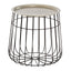 The base has a wireframe design that is configured around a circular centre. Each slim black line curves outwards from this point and travels upwards, tapering in to join the tabletop. The top is made from smooth iron and has a slightly recessed surface and round shape that complements the bulbous design of the base.