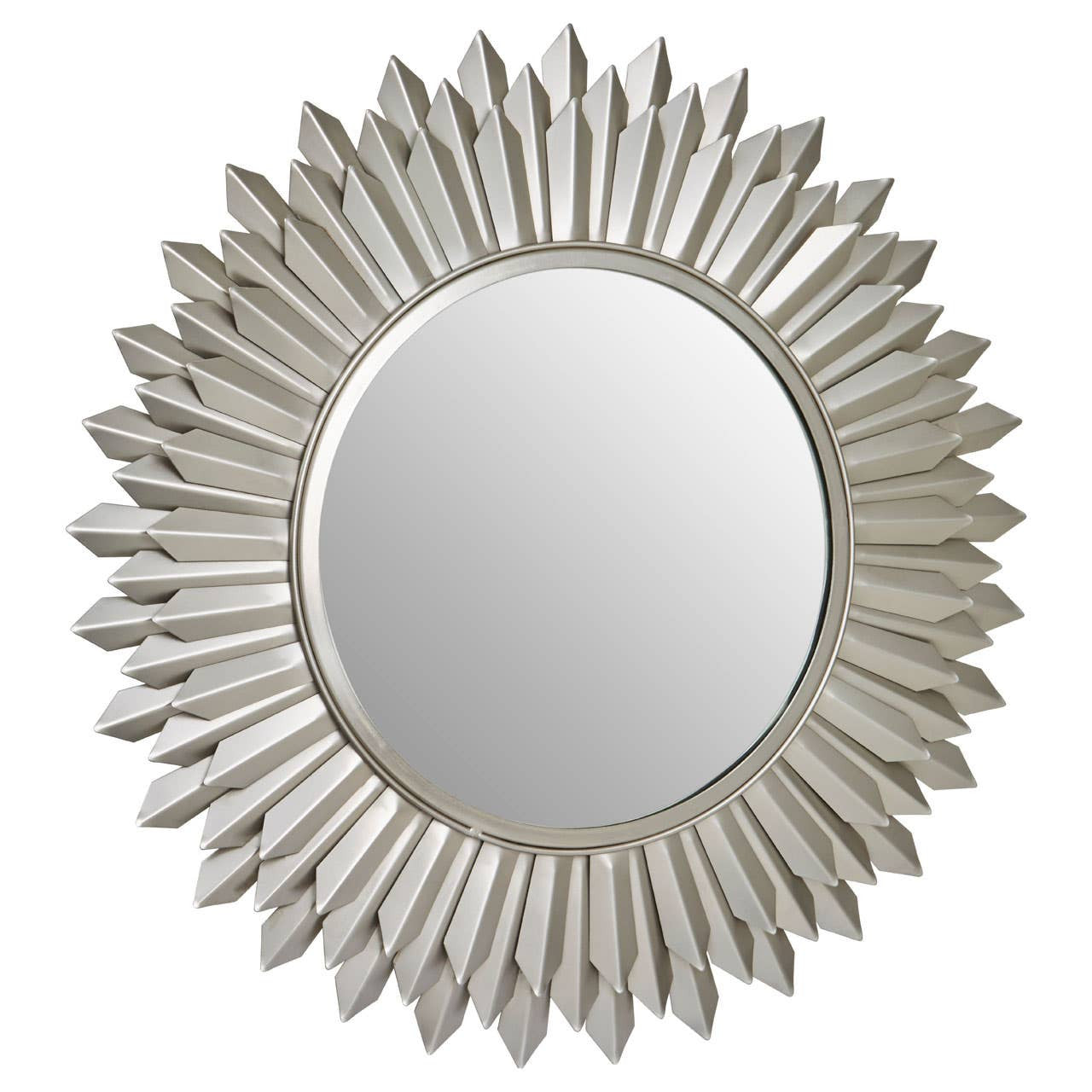 This sunburst design wall mirror features a nickel finish iron frame and a reflective mirrored centre. It has a luxurious texture and two layers of pointed shards in metallic silver, making it a contemporary focal point.