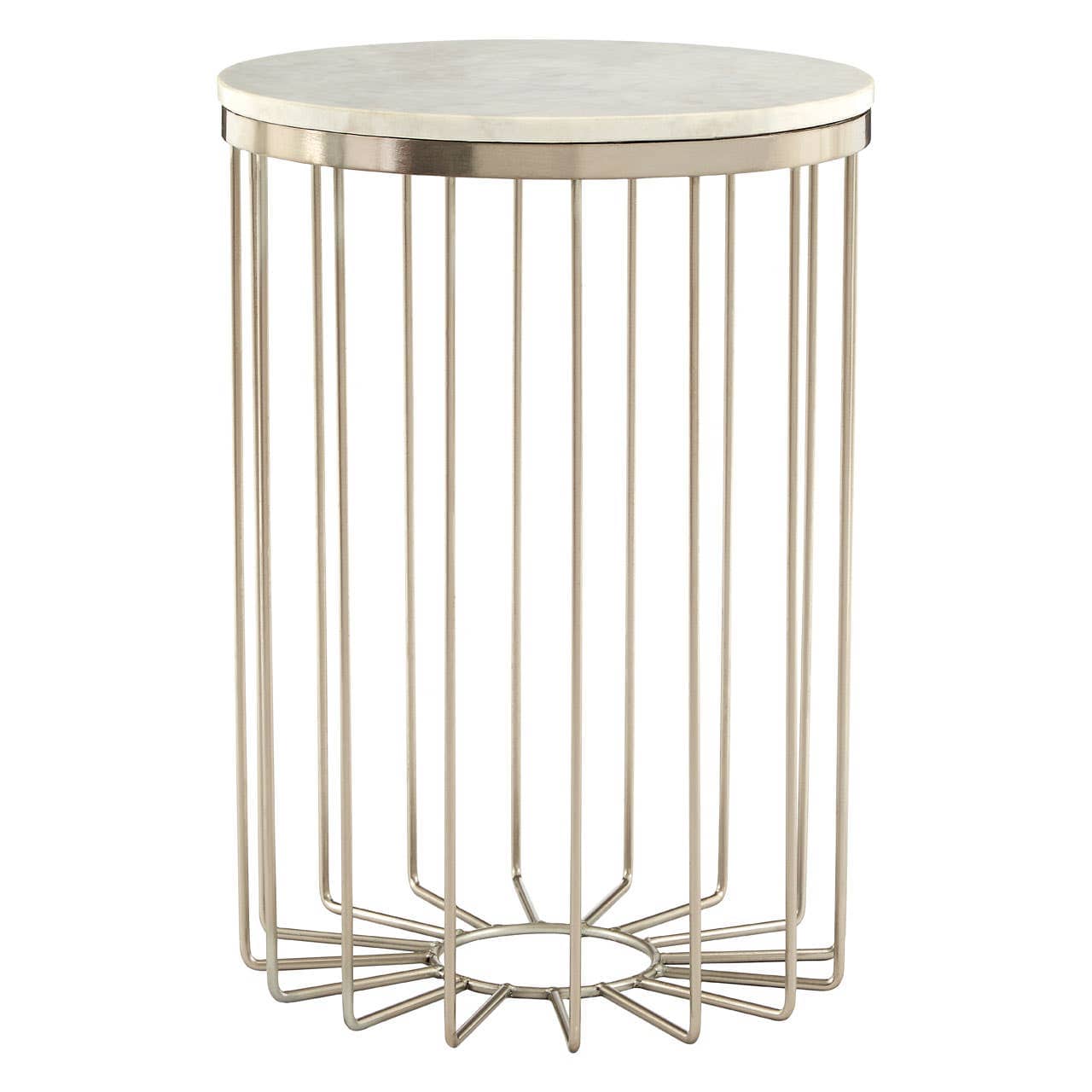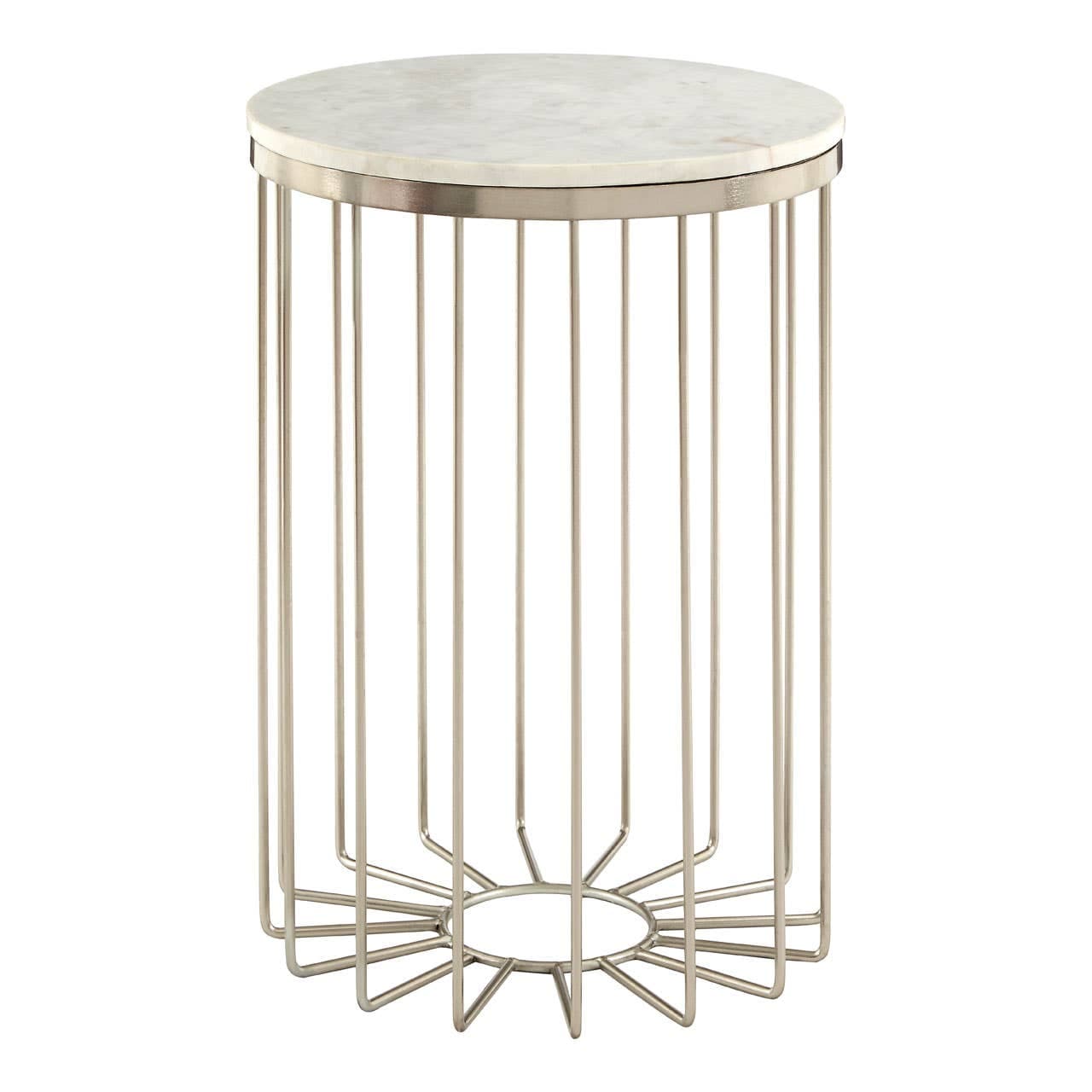 A series of cylindrical iron rods emerge from its small circular base, each one kinked to allow it to rise in support of the round tabletop. A corresponding band of iron is wrapped around the summit, forming a barrier between the rods and the marble. The marble top sports a series of irregular veins and mottles that subtly decorate its white surface. *This item is handcrafted so please expect slight variations to the finish*