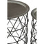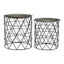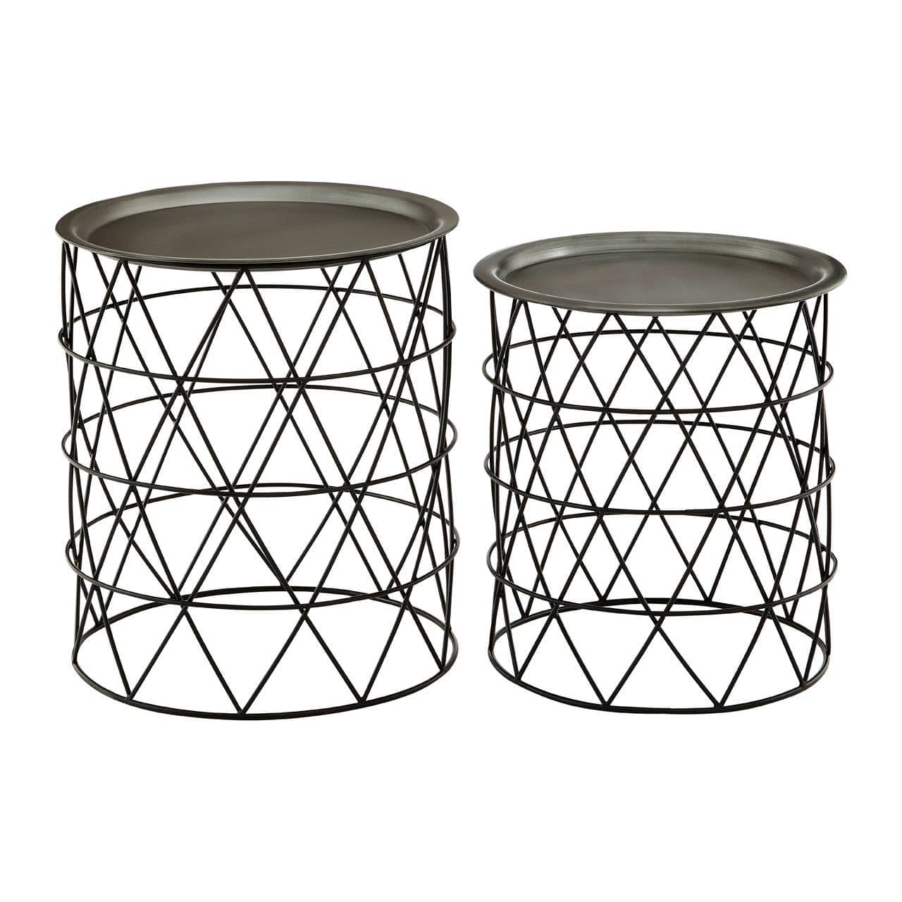 Both tables have tops made from sleek black zinc and are individually crafted by hand. Each tabletop features recessed surface areas and rounded lips, their soft lines counterpointing the straight angles of the bases. The cylindrical iron bases are characterised by their triangular patterns and look good styled with wireframe lighting. *This item is handcrafted so please expect slight variations to the finish*