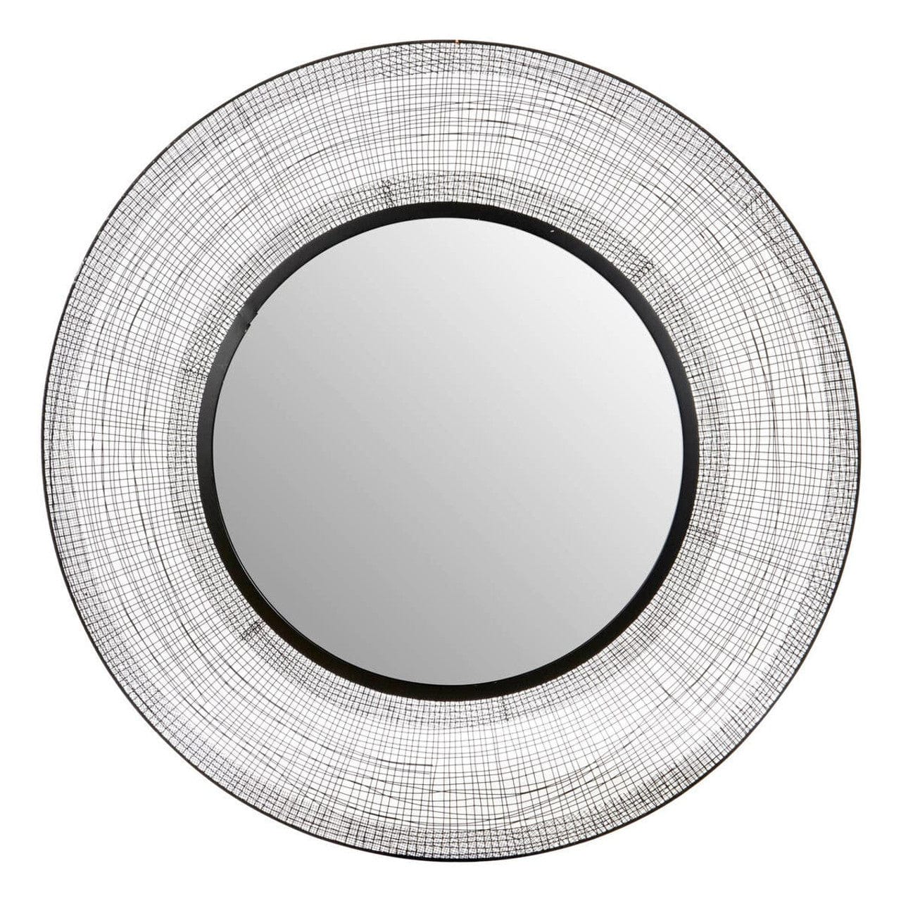 The Trento round wall mirror has a crosshatched pattern created from slender, black finish metal wires. It is encased in sleek black metallic rims that give this mirror?s frame an elegant finishing touch. The wire mesh stripes around the edges add strength and character to the hand-woven construction.