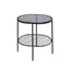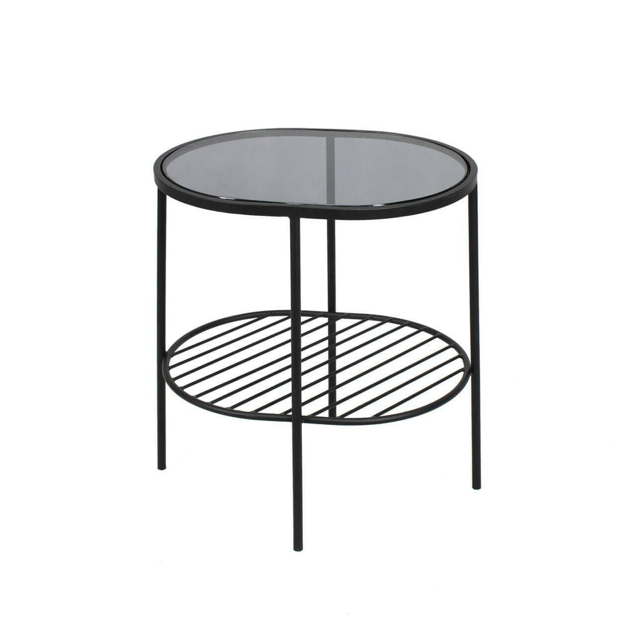 Made from sleek iron frame accented in black finish, this modern end table features a streamlined silhouette with a mix of clean and rounded lines. The round tabletop is inset with grey glass that forms a tonal contrast with an undercarriage in angular detail, offering essential space.
