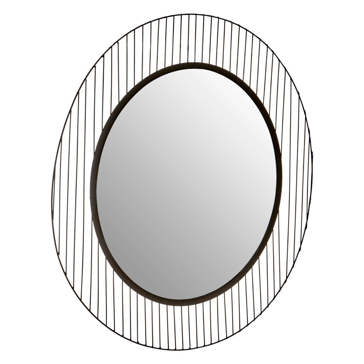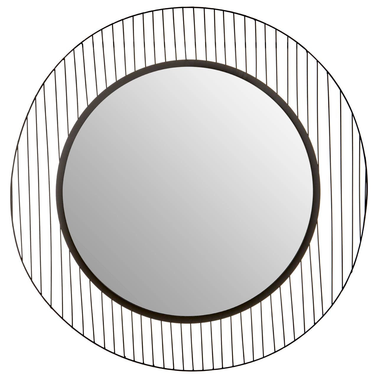 Sleek black finish metal wires combine to form the linear pattern circular frame of this wall mirror. The contemporary frame features a slim inner rim which creates a monochromatic contrast with the reflective mirrored surface. The mirror's openwork design and vertical lines contribute to its symmetrical construction.
