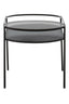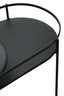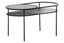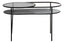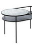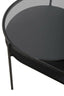 Made from metal and accented in a rich metallic black finish, this table features soft oval shaped curves forming twin tabletops. A round grey glass inset in one corner of the half open upper section with contrasting lower shelf and sleek legs which complete the modern industrial aesthetic.