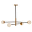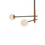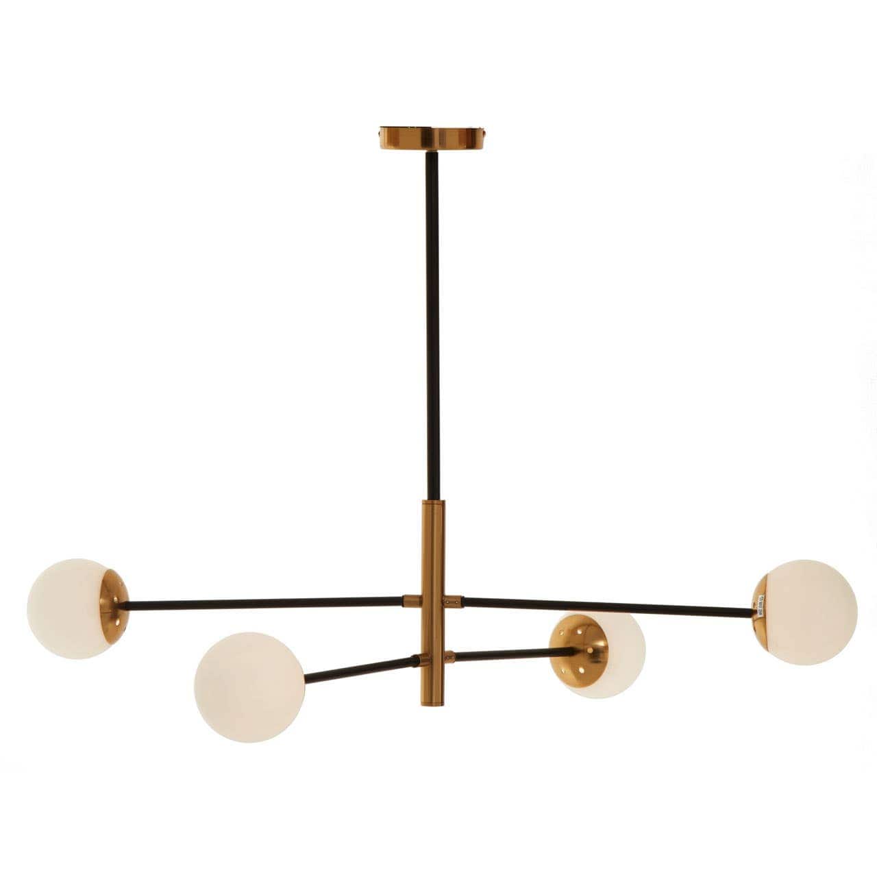 This pendant light features a sleek and angular profile. The slim four-bulb rods in a black finish are fixed neatly around a gold effect metal stem that contrasts with the white glass shades and offers a timeless mid-century modern appeal.
