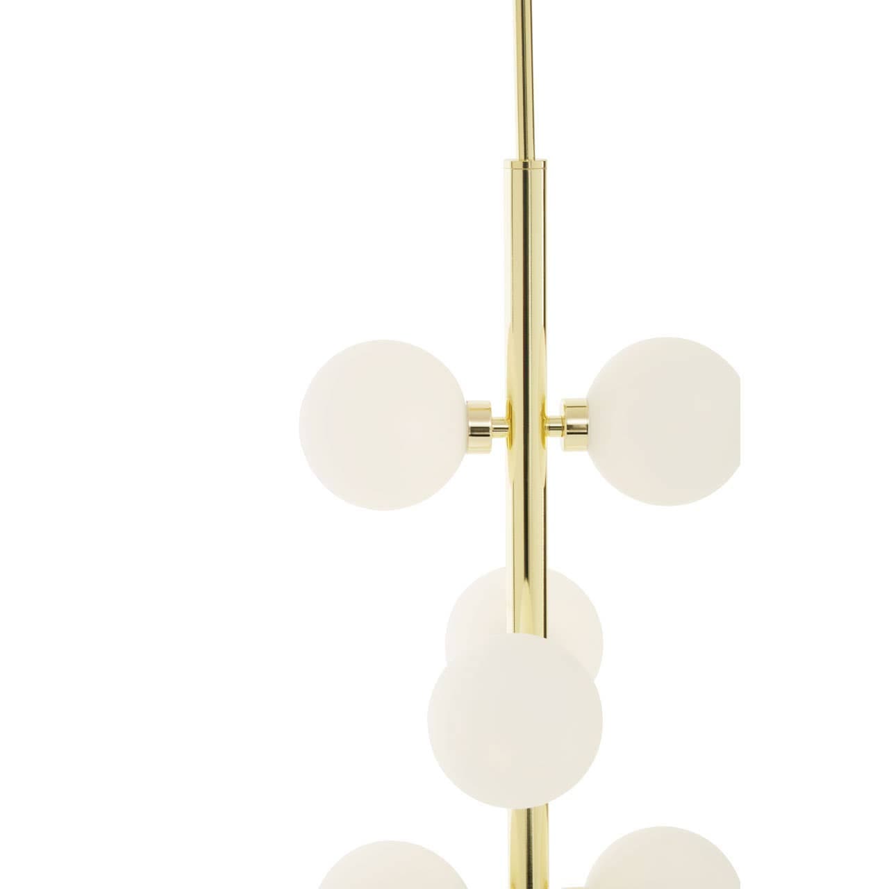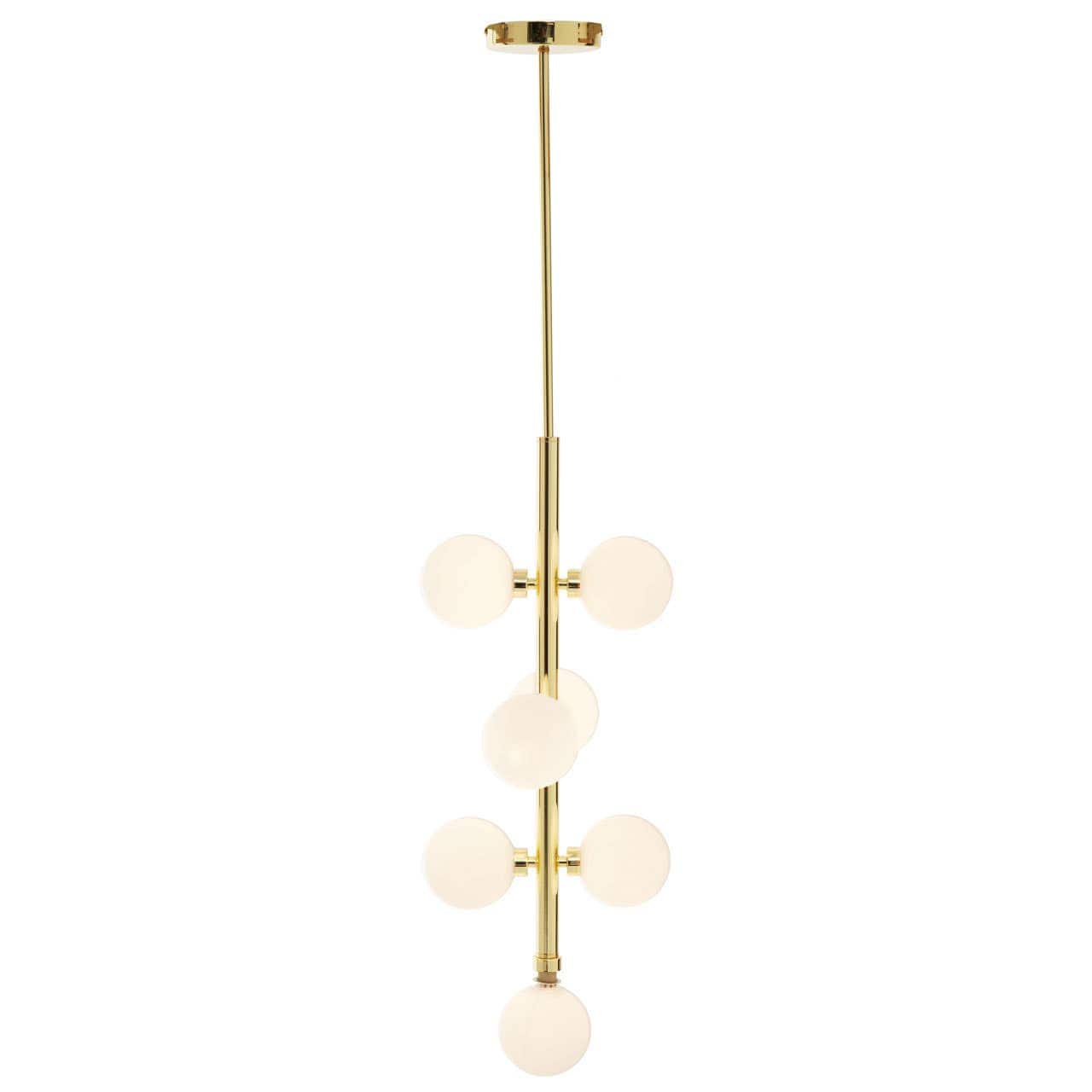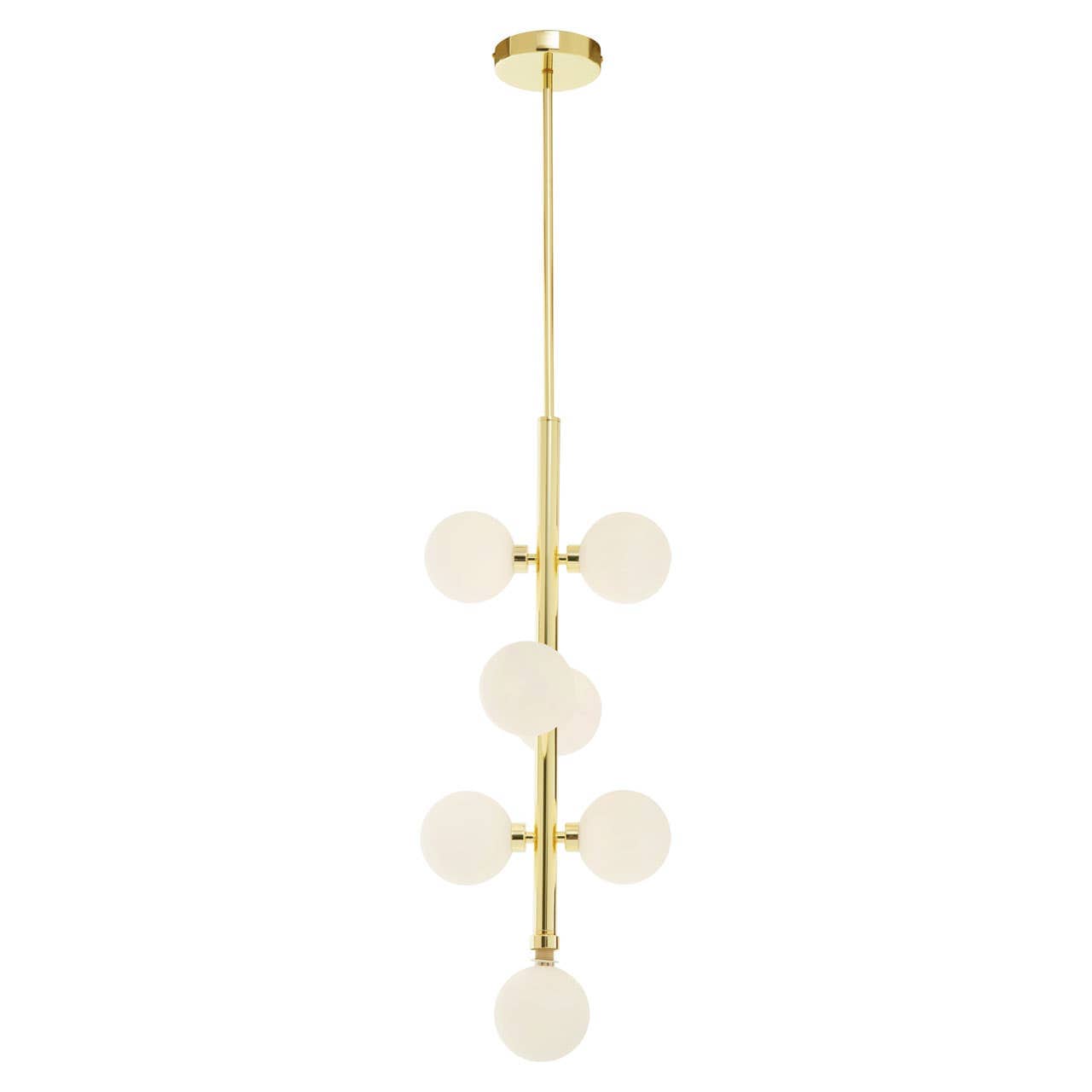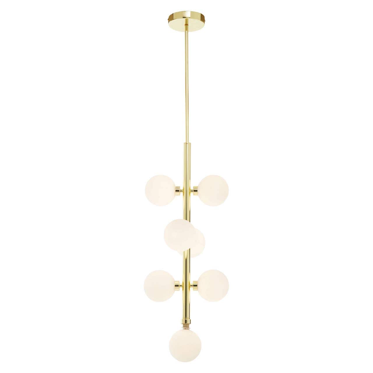 This pendant light emanates a vibrant arrangement of seven globe-shaped glass shades. Lending a glamorous aesthetic to the interior, these white glass bulbs adorn the bronze finish vertical stem attached to a round canopy.