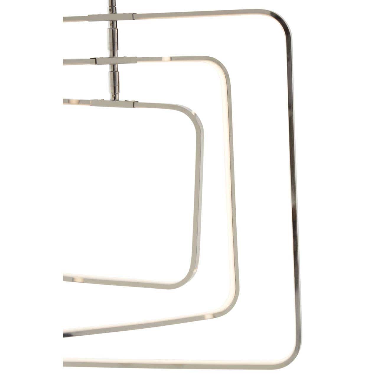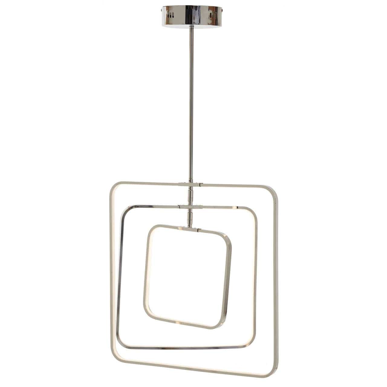 This pendant light is crafted from robust aluminium in chrome finish and features a slender and rotatable geometric framework. This light is attached to a sleek and adjustable rod supported by a sturdy round canopy.