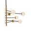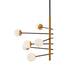 This pendant light features a sleek and angular profile. The slim twelve-bulb rods in a black finish are fixed neatly around a gold effect metal stem that contrasts with the white glass shades and offers a timeless mid-century modern appeal.