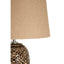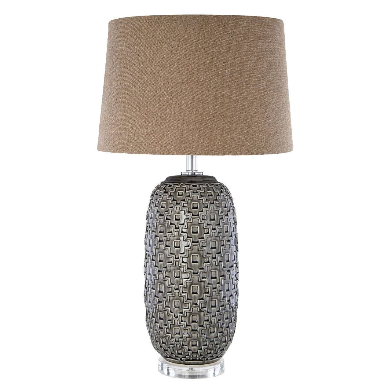 The Udele table lamp is notable for its oblong ceramic base which rests securely on a transparent acrylic plinth. The base is made from strong ceramic, with a distinctive geometric pattern adding texture to its grey surface. The natural linen shade has a brown/grey finish which complements the muted tones of the base.