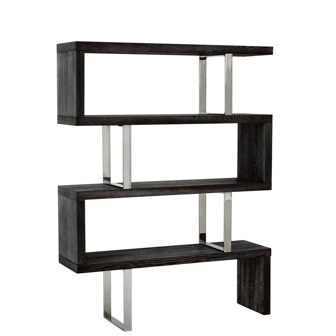 Forming modular compartments, this four-tiered shelf unit will make an instant statement with its soft industrial style. Made from sustainable elm wood in the black ash finish and stainless steel, this shelf unit creates a series of asymmetrical shelves.