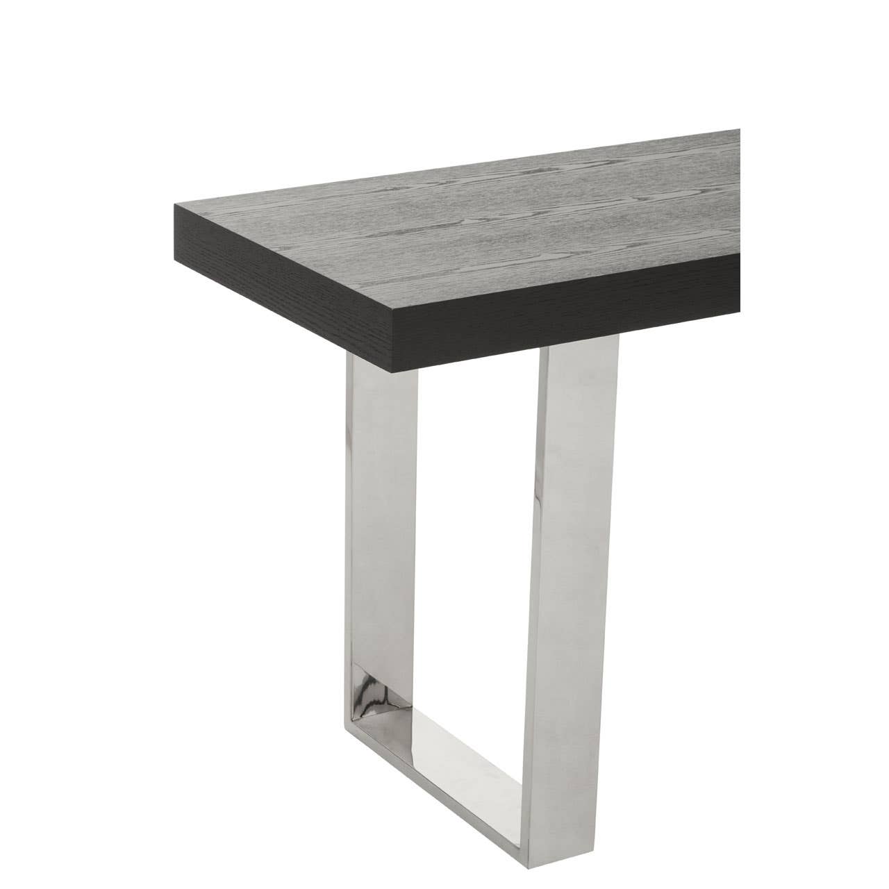 Made from black ash elm wood, this console table has a rectangular top in rustic texture. The stainless steel U-shaped sledge base supports the sleek wooden plinth and offers an understated aesthetic.