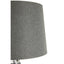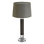 The lamp's tapered drum shade is created from soft grey linen, creating an ambient light when illuminated. The body is elevated by a round metal plinth boasting a reflective chrome finish that adds a cool metallic accent to this stylish piece. The lamp's stand features a corrugated black section, contrasting with the smooth finish of the base.