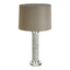 Its shade is coloured a subdued grey and is made from tactile fabric, meaning that it will diffuse light softly. Chrome accents at the bulb fitting and base sections introduce a reflective touch to this accent piece. The marble pillar is coloured white, with darker veins swirling across its surface for a unique patterned finish.